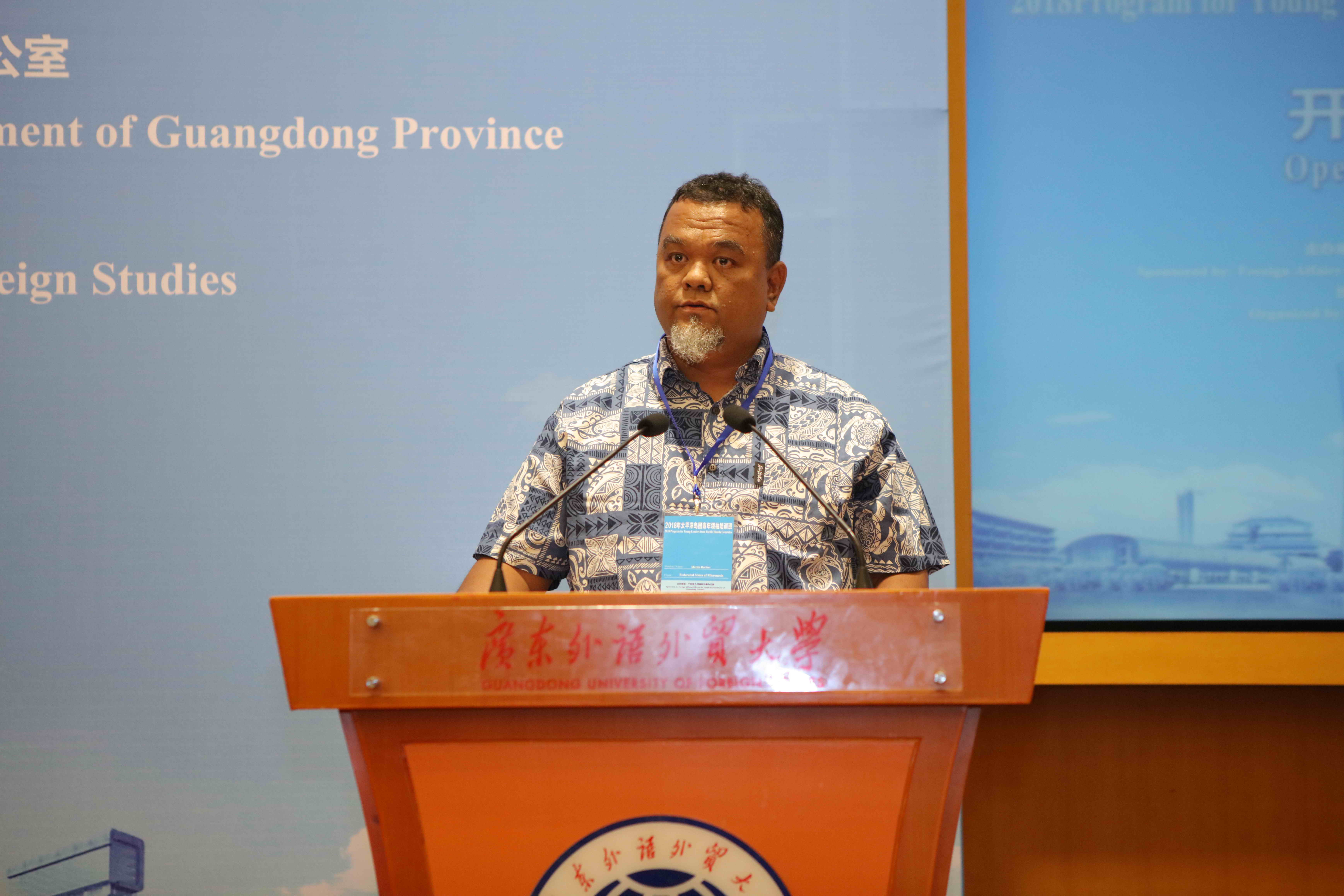 石佑启代表学校对来自大平洋7个岛国的38名学员表示热烈欢迎,对广东省人民政府外事办公室的支持表示感谢。他指出,“一带一路”倡议提出5年来,国际社会广泛支持,积极参与,促进了沿线国家的发展和繁荣,创造了大量就业机会,提高了民众的生活水平。中国实施改革开放40年以来,取得了举世瞩目的成绩,并前所未有地接近民族复兴的伟大目标。学校将继续坚持内涵发展,加快改革创新,大力推进教育国际化战略,为国家对外合作交流做出更大贡献。