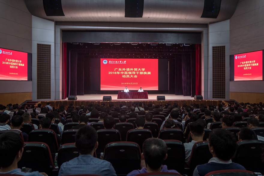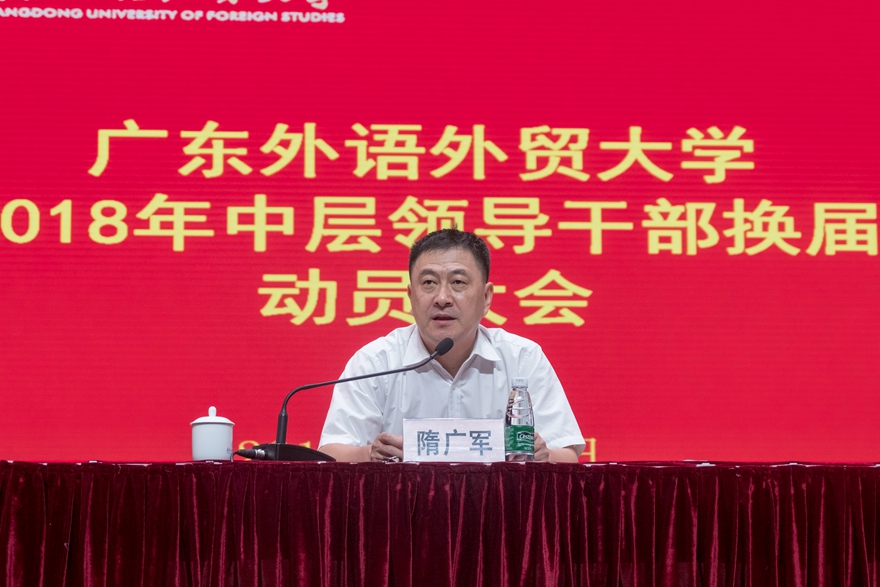 本次换届工作以习近平新时代中国特色社会主义思想为指导,深入贯彻落实新时代干部工作新精神新要求,以学校党委今年6月印发的《广东外语外贸大学干部选拔任用工作实施办法》为基础,选优配强中层领导班子和领导干部,为学校事业发展提供坚强的组织保证。隋广军代表学校党委,对本届全体中层领导干部及教职员工在学校事业发展中所做出的贡献表示衷心的感谢。对于做好中层领导班子和干部换届工作的重要意义,他指出,要从对标“双一流”推进高水平大学建设的需要、激励干部新时代新担当新作为的需要、贯彻落实新时代党的组织路线和优化干部队伍结构的需要三个方面充分认识。
