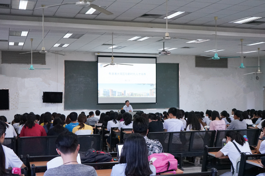 本网讯 9月28日,我校党委书记隋广军在南校区教学楼G207为会计学院、教育学院的200多名学生讲授了一堂题为“粤港澳大湾区与新时代人才培养”的“思想政治第一课”。他以“大湾区”和“大学生”为关键词,阐明粤港澳大湾区的建设现状及其发展前景,鼓励同学们在大湾区建设启动的今天抓住机遇,全面发展。校党委宣传部、教务处、马克思主义学院的相关负责人与教师参加了学习。