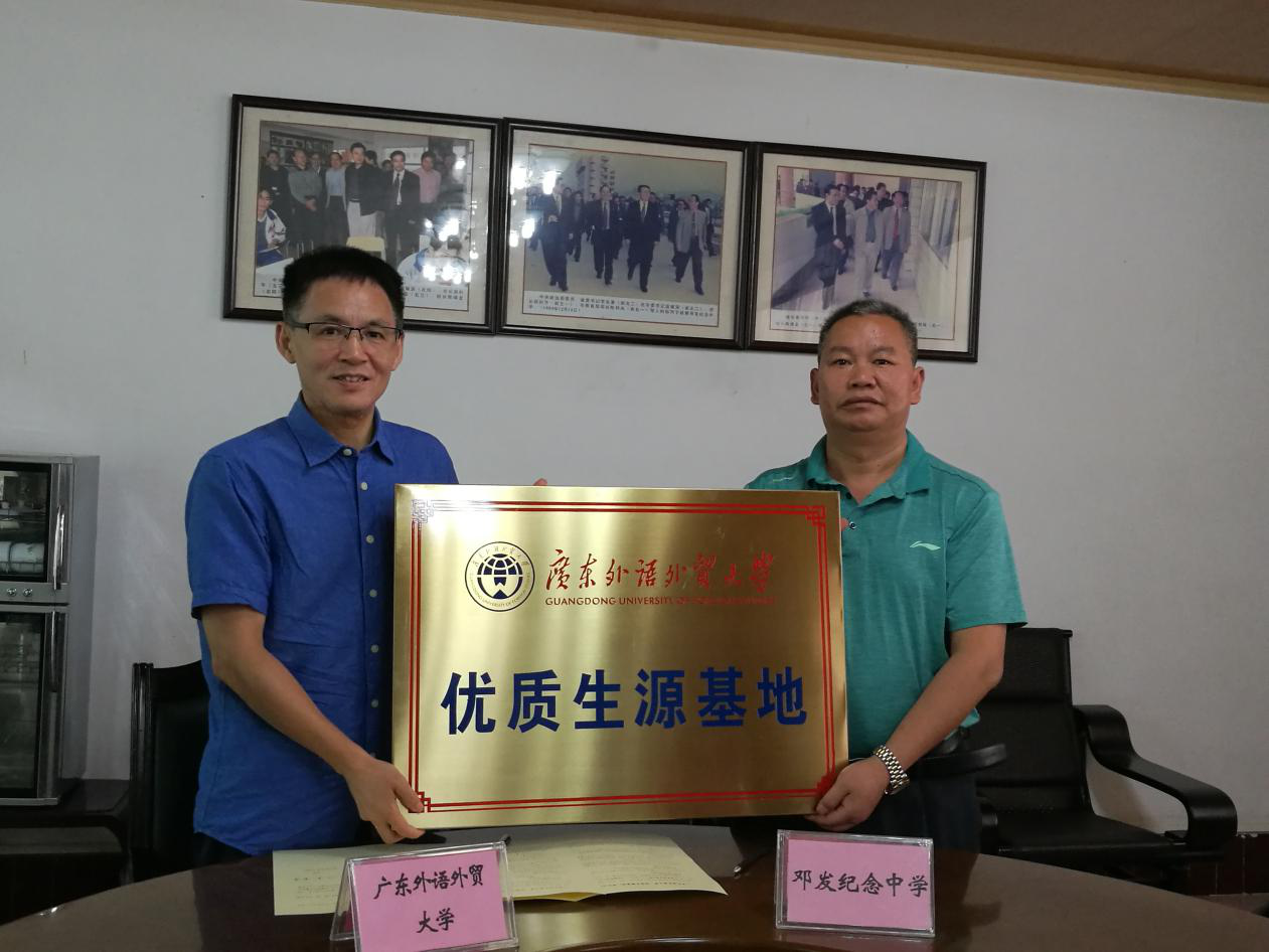 本网讯 为加强我校与重点高中的交流和沟通,吸引更多优秀生源,6月26日至27日,经济贸易学院工作人员一行赴云浮罗定中学、邓发纪念中学开展招生宣传工作,并举行“优质生源基地”签约授牌仪式。