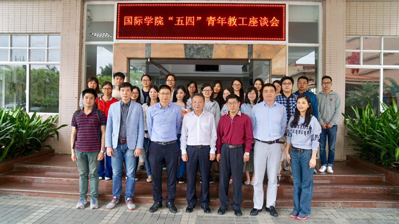 本网讯 4月27日下午,国际学院“五四”青年教工座谈会在北校区国际学院103会议室召开。我校副校长陈林汉,国际学院党总支书记钟罗军,副院长魏辉良、刘明以及学院各青年教工代表近30人参加了交流座谈。