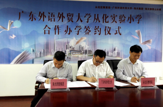 本网讯 4月20日下午,我校与从化区教育局、珠光控股集团签订三方合作办学协议,标志着广外基础教育合作办学首个公办学校——广外从化实验小学正式落户从化。我校副校长刘建达,从化区委常委、常务副区长吴林波,从化区政府办公室副主任薛庆波,从化区教育局局长罗树人、副局长钟汉文,珠光控股集团总裁刘捷、副总裁曾加勤、市场经营管理中心总经理利瑛,我校教育集团总经理孙建军、附设外语学校校长万清华等出席签约仪式。