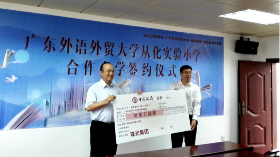 珠光控股集团对广外从化实验小学的未来充满信心。曾加勤认为,珠光集团的品牌 “硬配套”、广外品牌教育的“软实力”、从化区教育局先进的办学理念与管理,必将使学校成为从化的精英教育基地。签约后,刘捷代表珠光控股集团向我校捐赠基础教育发展基金200万元。