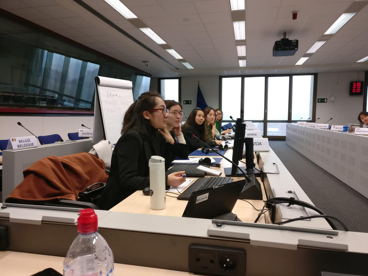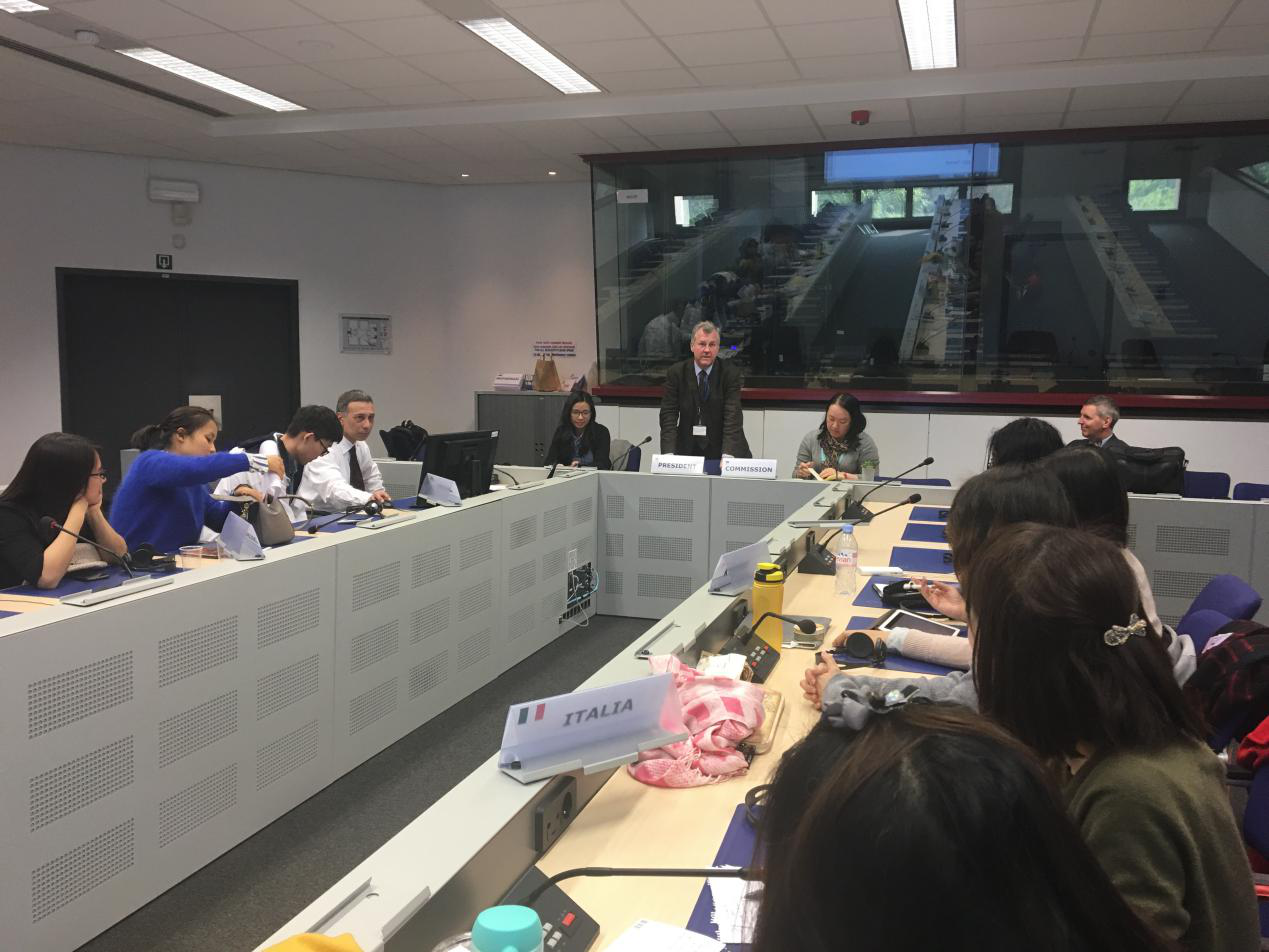 4月3日开始,两位学员在欧盟口译司的安排下,与上海外国语大学、对外经济与贸易大学的学员一道参加了形式多样、生动有趣的培训和指导。欧盟委员会口译总司Paul Brennan, Andy Upton, David Smith等多位资深译员全身心投入到了对学员的培训之中。这些培训指导旨在提升译员讲话的可信度,时态运用和信息把握准确度。除培训之外,欧盟口译司还安排了多场极富启发意义的会谈,学员们有幸与欧盟对外行动署(EEAS)的Christopher,德国法兰克福汇报(FAZ)资深记者Michael就欧盟现状和中欧关系进行了交流。