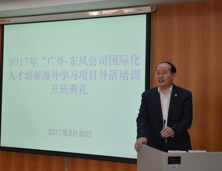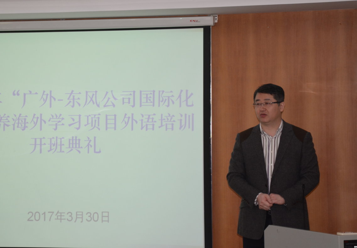 本网讯 3月30日,我校在北校区举行广外-东风汽车公司国际化人才培养海外学习项目培训班开班仪式。东风汽车公司人事(干部)部培训处处长陈向阳、主任饶超,我校副校长阳爱民、国际服务外包研究院院长林吉双等以及东风汽车公司全体学员出席开班仪式。开班仪式由国际服务外包研究院副院长陈和主持。