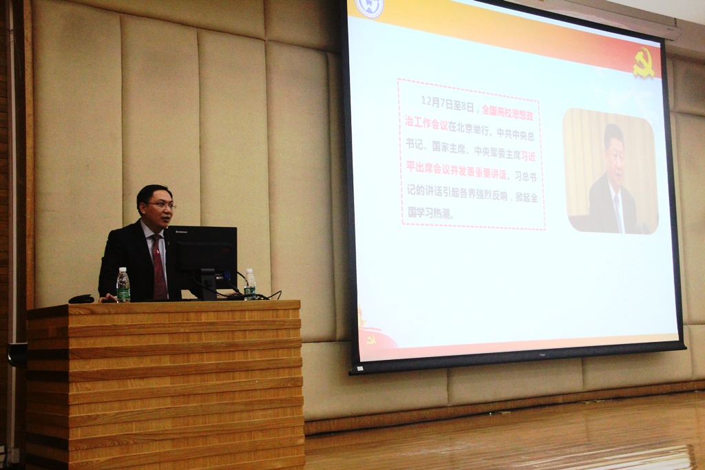 会上,刘海春传达习近平总书记全国高校思想政治工作会议讲话精神,并结合学生工作实际为全体学工干部作主题为“坚持立德树人核心 推进高校思政工作”专题报告。他指出,全国高校思想政治工作会议是在当前高校学生工作面临新形式、新任务和新挑战的背景下召开的,讲话坚定了社会主义办学方向,为新形势下高校思政工作提供了根本遵循,具有十分重要的意义。他高度凝练了习近平总书记讲话内容,即“三个精神”“四个坚持不懈”“加强‘三个认同’”“四个正确认识”和“五个要”,要求大家自觉贯彻践行讲话精神,推进理论创新,提升实践效果,立足四个“正确认识”,培养学生“四个自信”,将“马魂、中根、西践”的原则贯彻在具体的工作中。