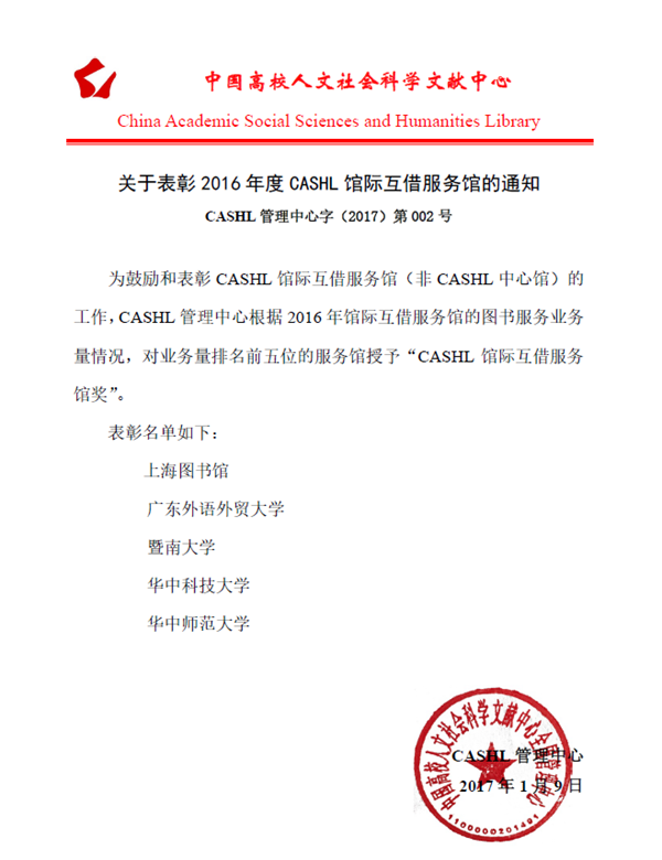 本网讯 近日,我校图书馆在2016年度CASHL馆际互借服务中贡献突出,喜获年度CASHL馆际互借服务馆奖。为鼓励和表彰CASHL馆际互借服务馆(非CASHL中心馆)的工作,CASHL管理中心根据2016年馆际互借服务馆的业务量情况,对业务量排名前五位的服务馆授予“CASHL馆际互借服务馆奖”。同批获奖的单位还有上海图书馆、暨南大学、华中科技大学、华中师范大学,这也是CASHL管理中心第一次对服务馆进行表彰。