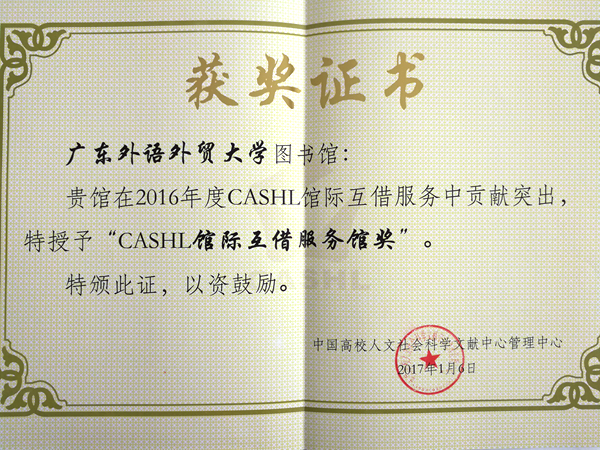 我馆自2013年被选为CASHL服务馆以来,秉承CASHL的服务理念,致力于为全国高校读者提供优质的服务。历年来的努力工作得到了CASHL管理中心的充分肯定。此次获奖,也证明了我校图书馆人文社科领域的外文原版图书馆藏在同行中有着明显的优势。藉此机会,也感谢全校师生读者对图书馆馆际互借和文献传递服务的支持与认可。