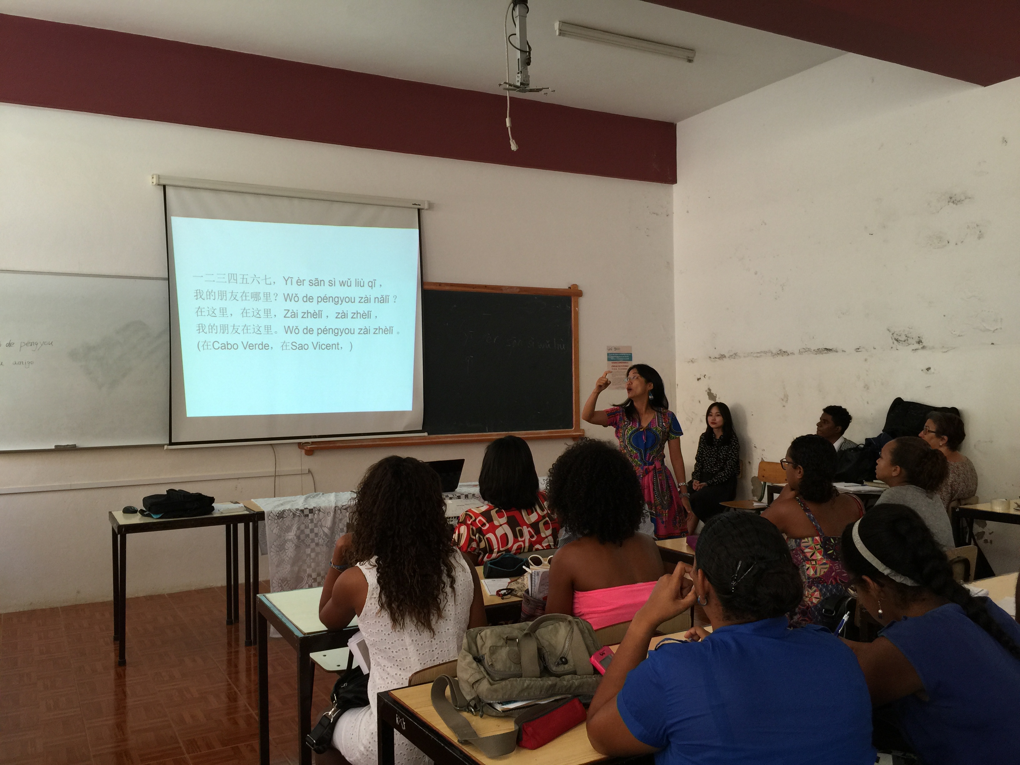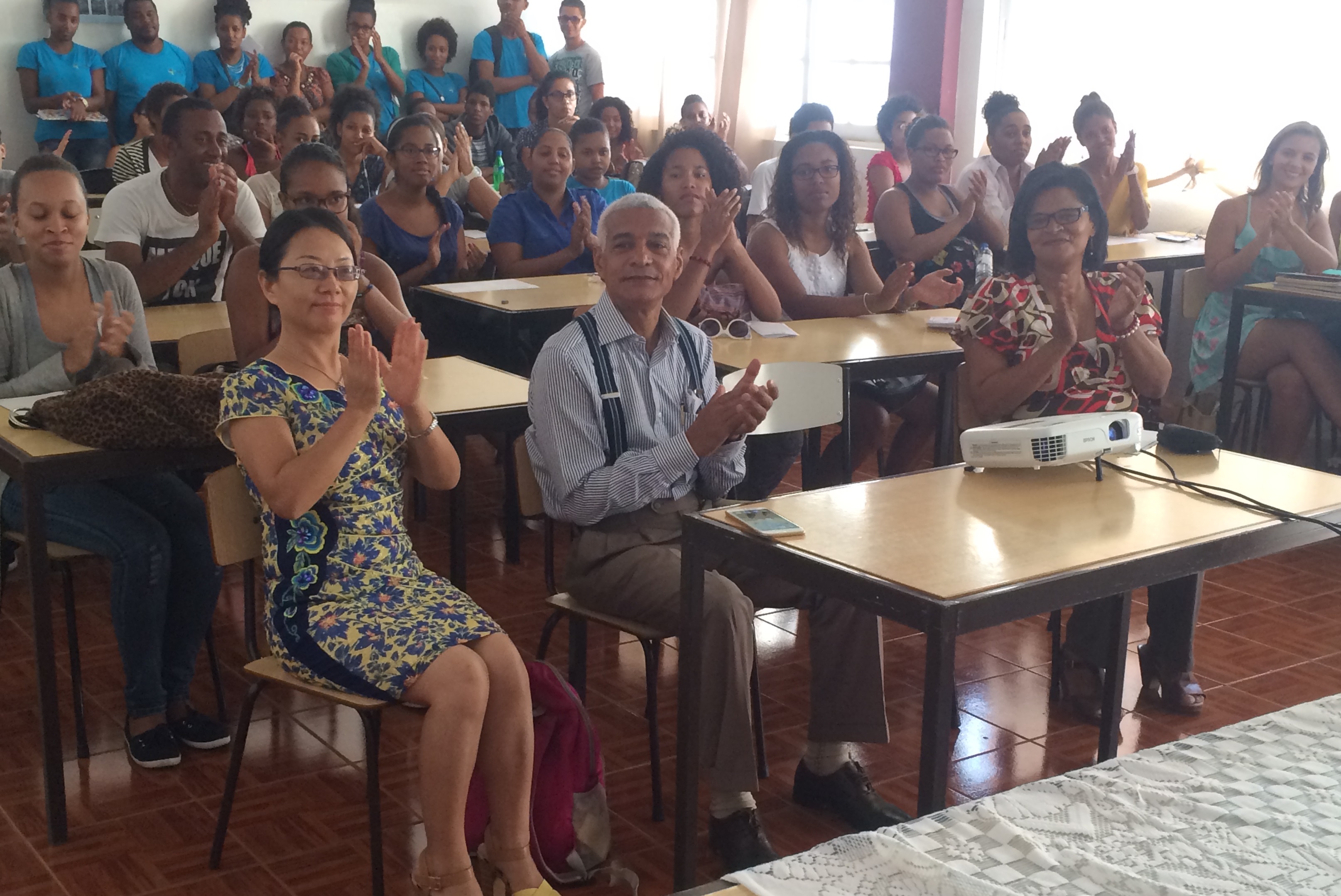 本网讯 4月20日,应佛得角外交部邀请,佛得角大学孔子学院在佛大圣文森特分校举行了一堂别开生面的汉语教学公开课。本次公开课是佛中友好交流40周年庆典的系列活动之一,主题为“学汉语,交朋友”。外交部代表——佛得角驻古巴前任大使曼努埃尔·马托斯、佛得角大学圣文森特分校人文社科系主任伊西多拉·福特斯、孔子学院中方院长郑庆君、孔子学院教师与行政人员以及佛大师生参加了这堂特别的公开课。