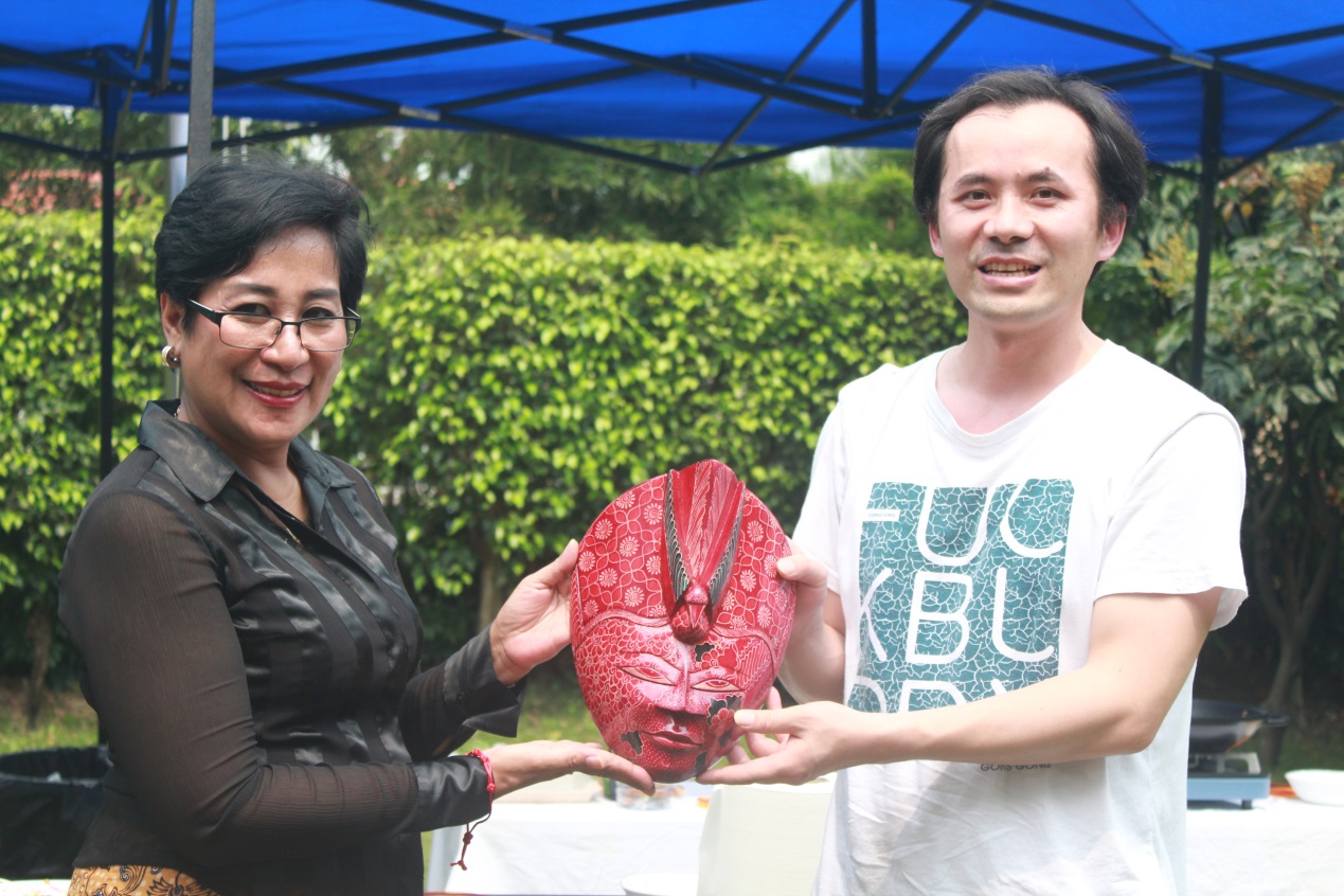 交流演出结束后,琇翡女士向我校印尼语系赠送纪念品。