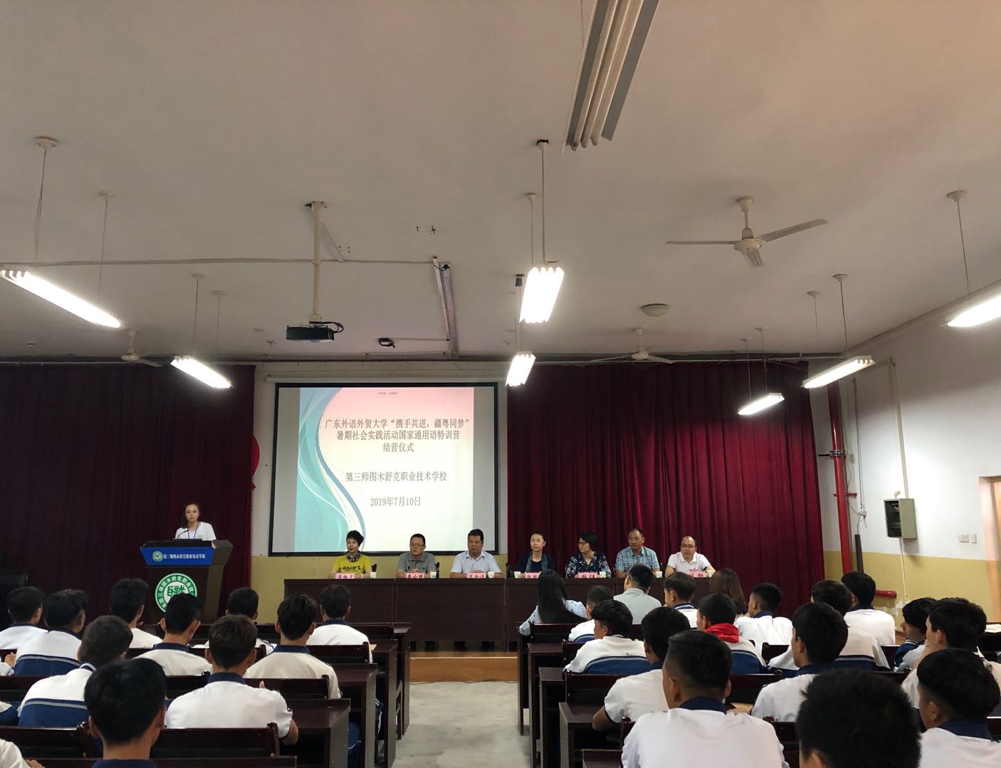 7月10日上午,“携手共进,疆粤同梦”国家通用语特训营结营仪式在第三师图木舒克市职业技术学校举行。图木舒克市人民政府党组成员、副市长(挂职)徐镱菲,五家渠市人民政府党组成员、副市长(挂职)陈金诗,图木舒克市团委书记安小明,广东外语外贸大学学生工作部(处)副处长国佳、第三师图木舒克市职业技术学校党委副书记、校长章朝阳等相关领导老师出席结营仪式。