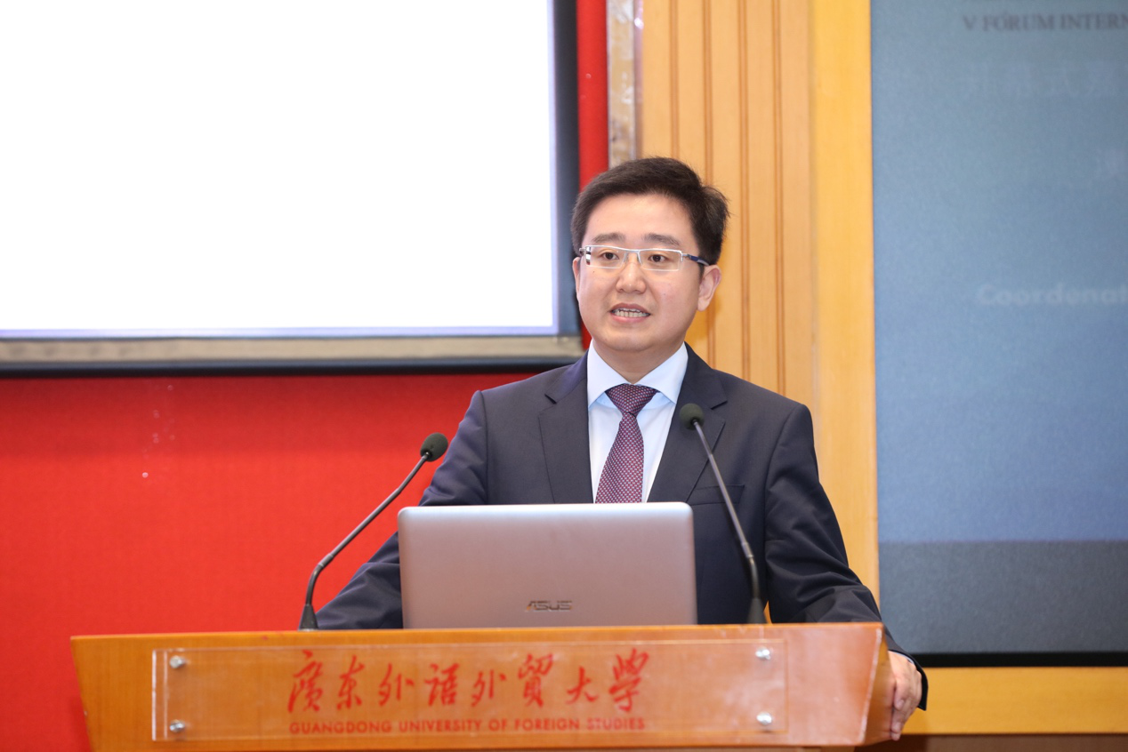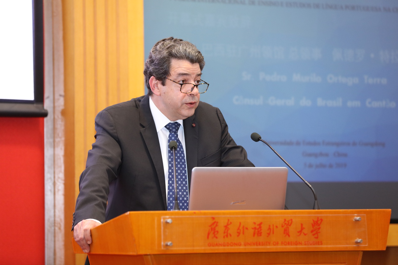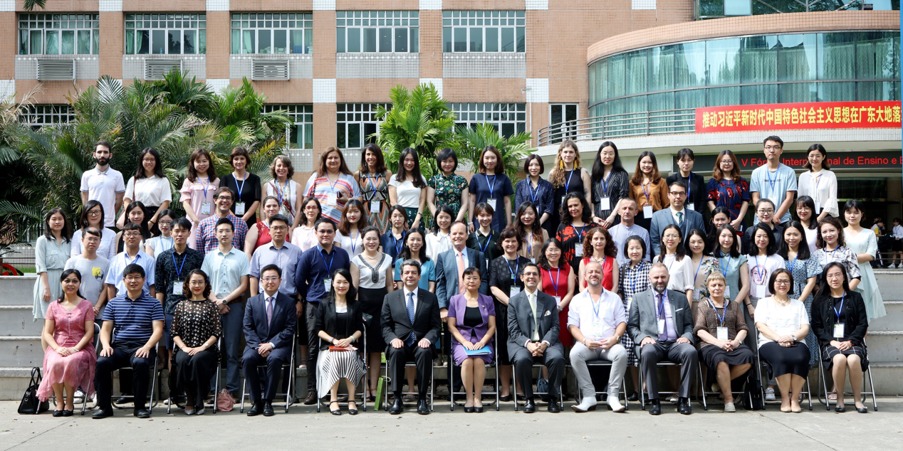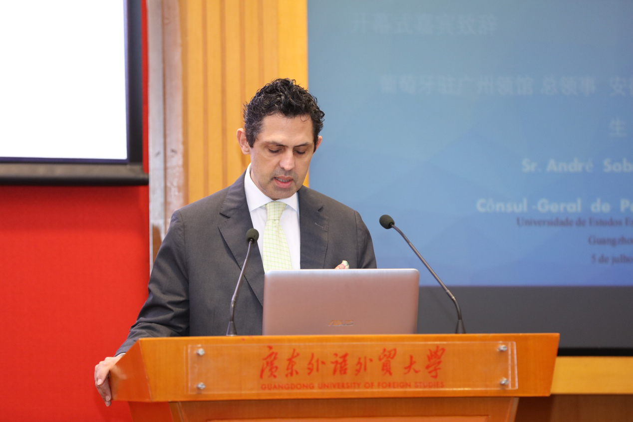 本网讯 7月5日至6日,第五届中国葡萄牙语教学及研究国际论坛在我校举行。来自葡萄牙、巴西、澳门特别行政区及中国内地24所高校的80余位葡萄牙语学者齐聚一堂,共同探讨中国葡萄牙语专业教学和人才培养问题。我校副校长王廷惠、葡萄牙驻穗总领事安德烈·科迪洛(André Sobral Cordeiro)、巴西驻穗总领事佩德罗·特拉(Pedro Murilo Ortega Terra)、澳门理工学院葡萄牙语教学暨研究中心主任张云峰出席开幕式并致辞。