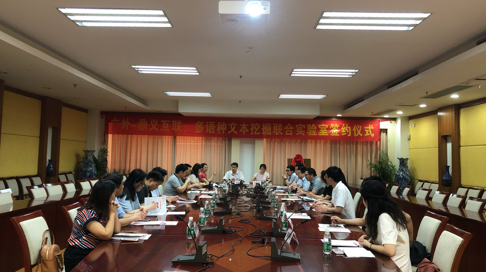 信息学院院长蒋盛益、信息学院党委书记朱珍葶,广东鼎义互联科技股份有限公司董事长任菁倩等出席签约仪式。签约仪式后双方就联合开展多语种文本分析和挖掘等方面的技术攻关、成果转化、产学研项目申报以及联合人才培养等方面进行深入讨论,并在面向东盟国家开展电子政务、数字经济等行业应用方面,对所涉及的语言信息处理相关技术方面达成了合作意向。