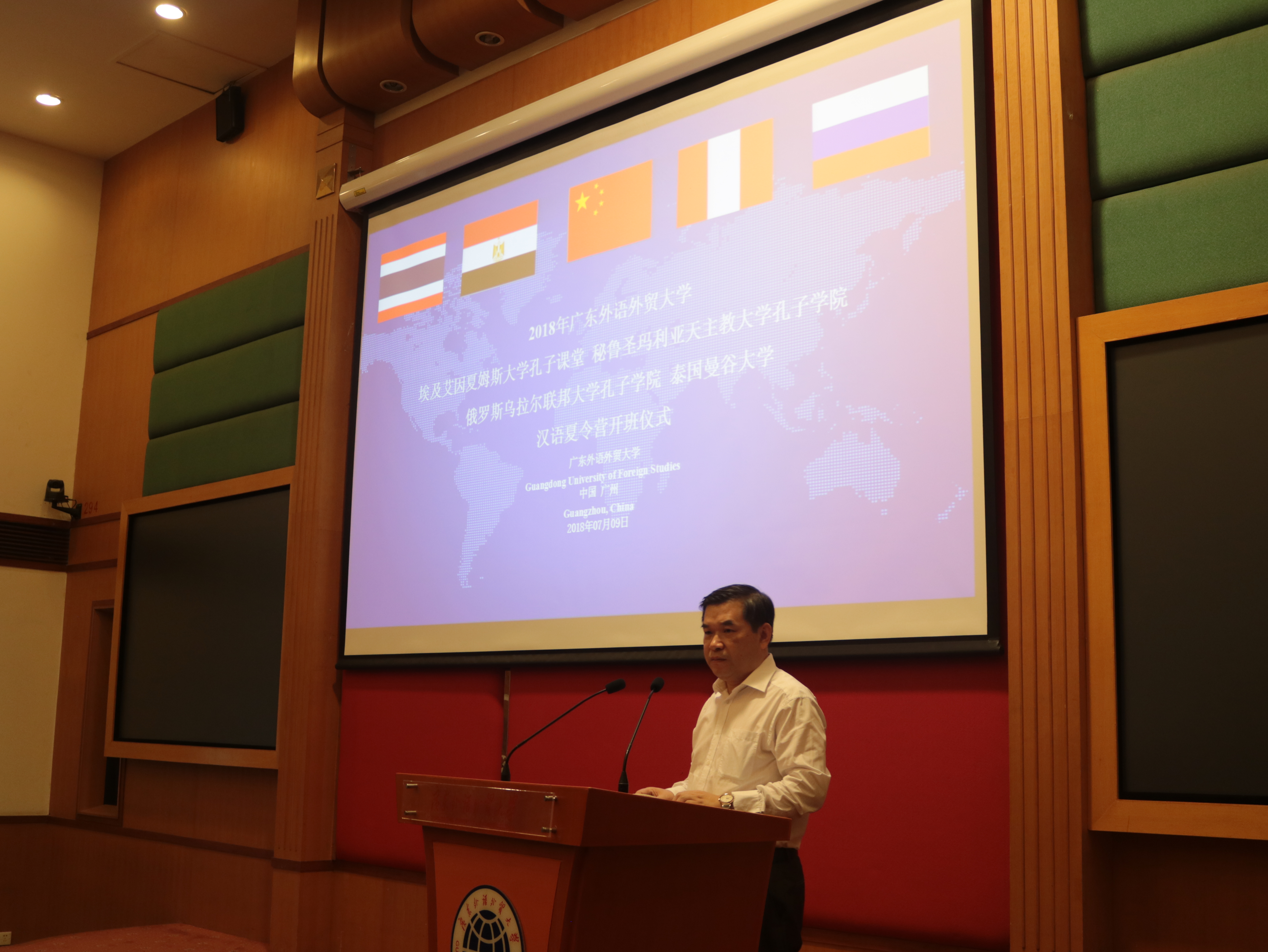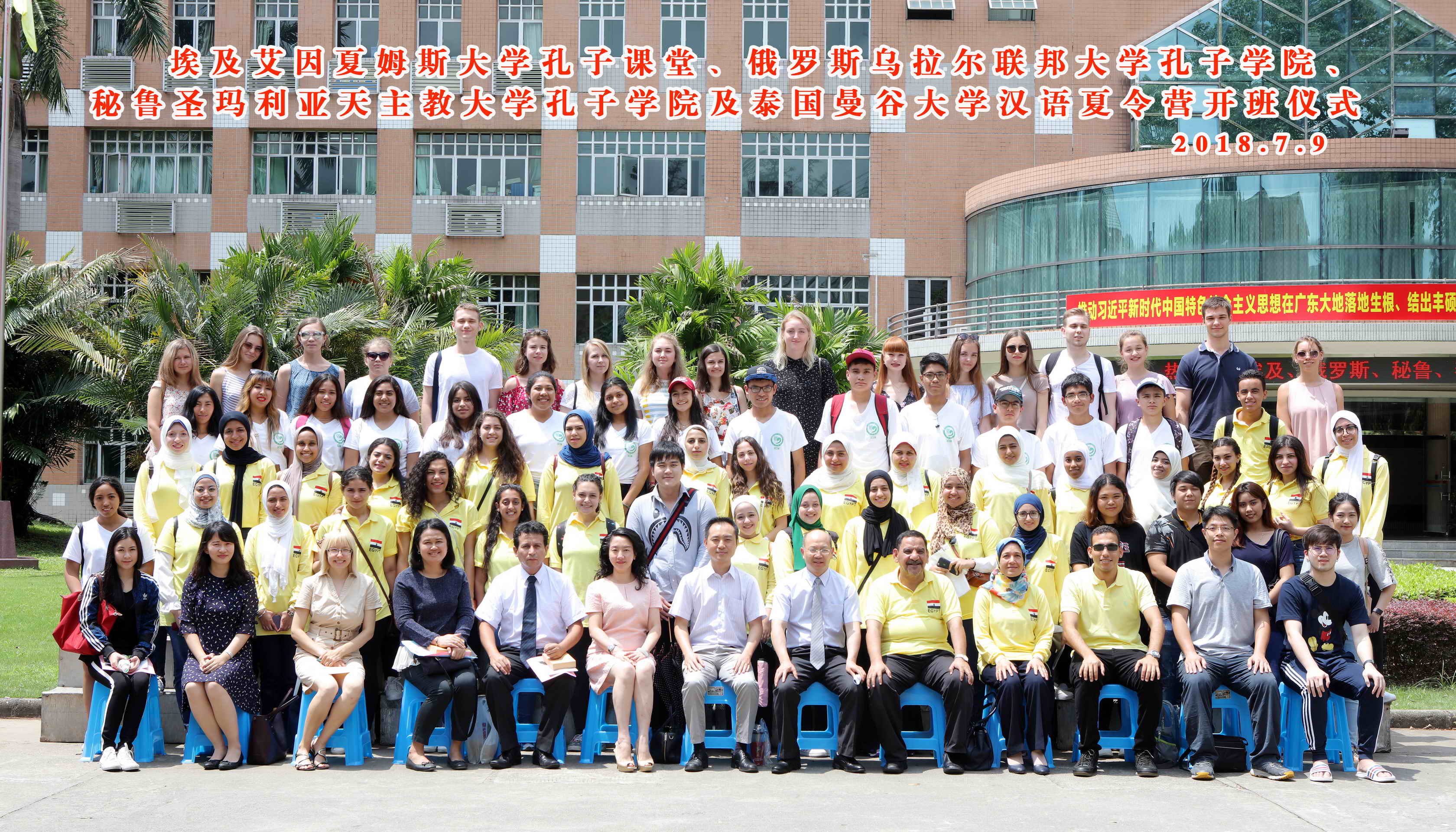 本网讯 7月9日上午,埃及艾因夏姆斯大学孔子课堂、俄罗斯乌拉尔联邦大学孔子学院、秘鲁圣玛利亚天主教大学孔子学院和泰国曼谷大学汉语夏令营开班仪式在我校行政楼国际会议厅举行。本次夏令营迎来了四所友好院校的近80名海外师生。