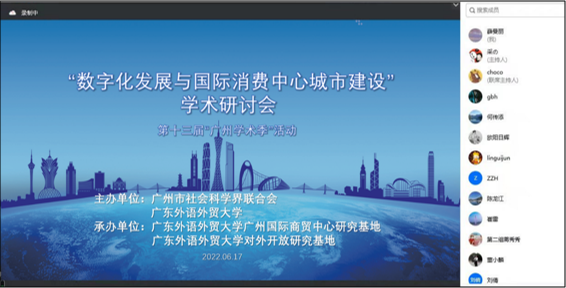 本网讯 6月17日上午,由广州市社会科学界联合会、我校主办,广州国际商贸中心研究基地、对外开放研究基地承办的数字化发展与国际消费中心城市建设学术研讨会采取“线上+线下”相结合的方式举行。校党委常委、副校长何传添,广州市社会科学界联合会科研规划部部长杨霖等出席会议。