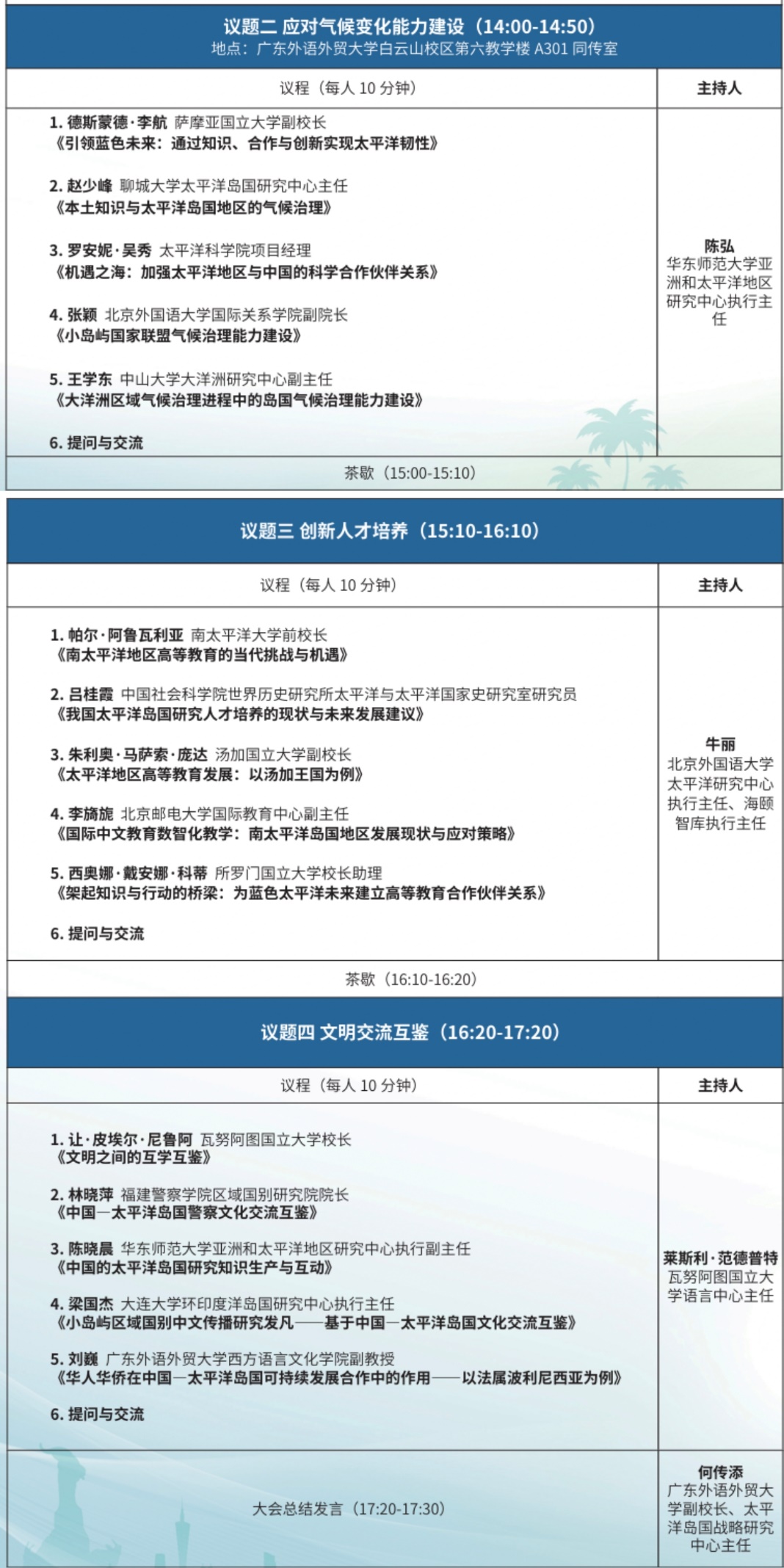 本次合作论坛邀请到太平洋岛国政要、驻华使节、高校校长及国内外知名学者共60余位,以学术为桥、以合作为弦,为中国与太平洋岛国人文交流奏响新篇。与会者将围绕“蓝色产业创新协同”“应对气候变化能力建设”“创新人才培养”“文明交流互鉴”等四大议题展开交流研讨,以思想的碰撞点燃合作火花,为推动中国与太平洋岛国可持续发展合作建言献策,为深化中国与太平洋岛国友谊献上祝福。