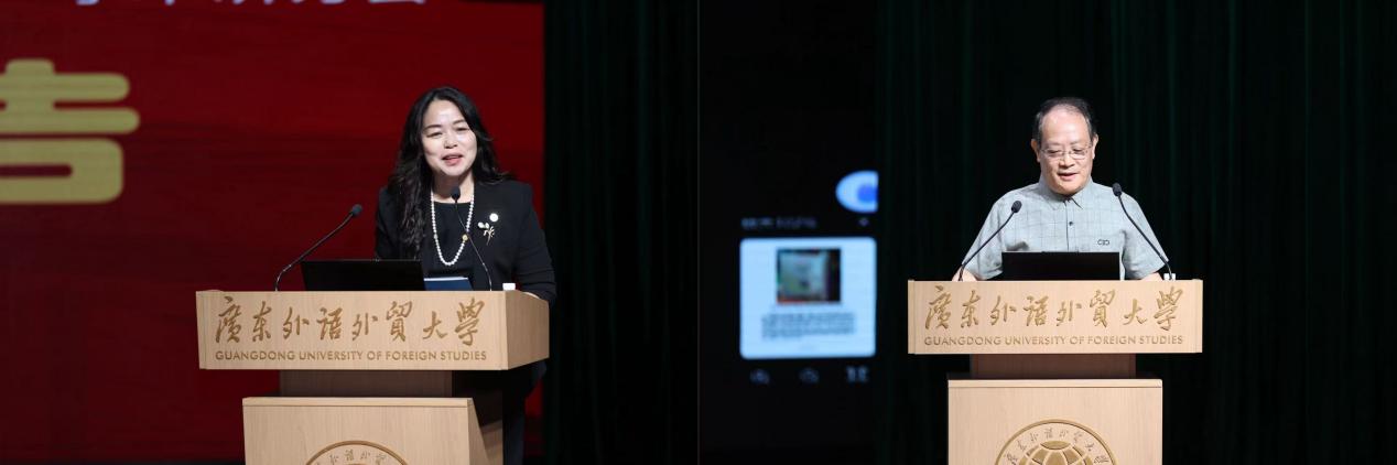 林敏洁主持(左)与陈多友做主旨报告(右)