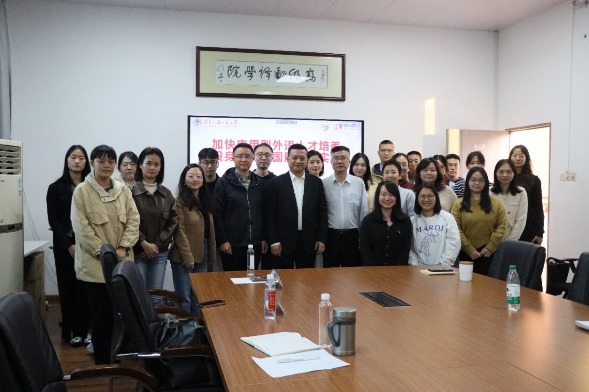 本网讯 12月1日,中国外文局翻译院院长、中国翻译协会副会长黄玉龙,翻译研究部主任吴晓蕊一行来我校调研交流。我校党委常委、副校长申明浩出席座谈会。双方就翻译与国际传播人才队伍建设、中国翻译协会“四译工程”落地实施、全国MTI导师培训等工作进行了深入交流。