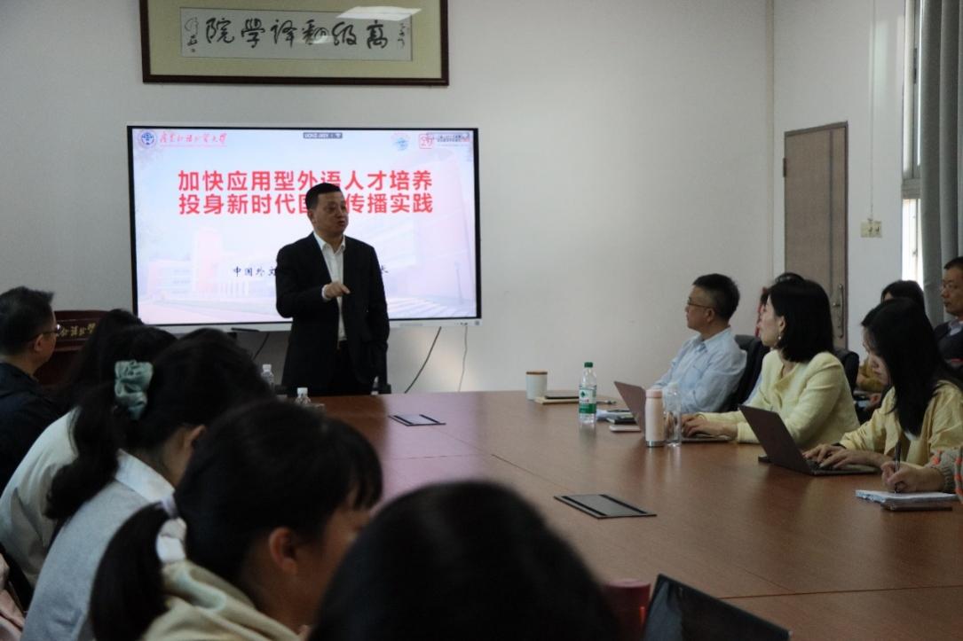 申明浩对中国外文局翻译院一行表示热烈欢迎,对该院长期以来给予我校的关心与支持表示衷心感谢。他指出,我校一直与外文局、外文局翻译院有着密切的沟通与合作,2023年与外文局翻译院、中山市委宣传部三方合作共建粤港澳大湾区翻译与国际传播实践基地,外文局翻译院还与我校高级翻译学院合作共建翻译研究与实践基地,有着良好的合作基础。希望以此次交流为契机,双方持续加强合作,尤其是在高端翻译人才培养、助力粤港澳大湾区对外传播事业等方面,进行资源对接,互促共赢。