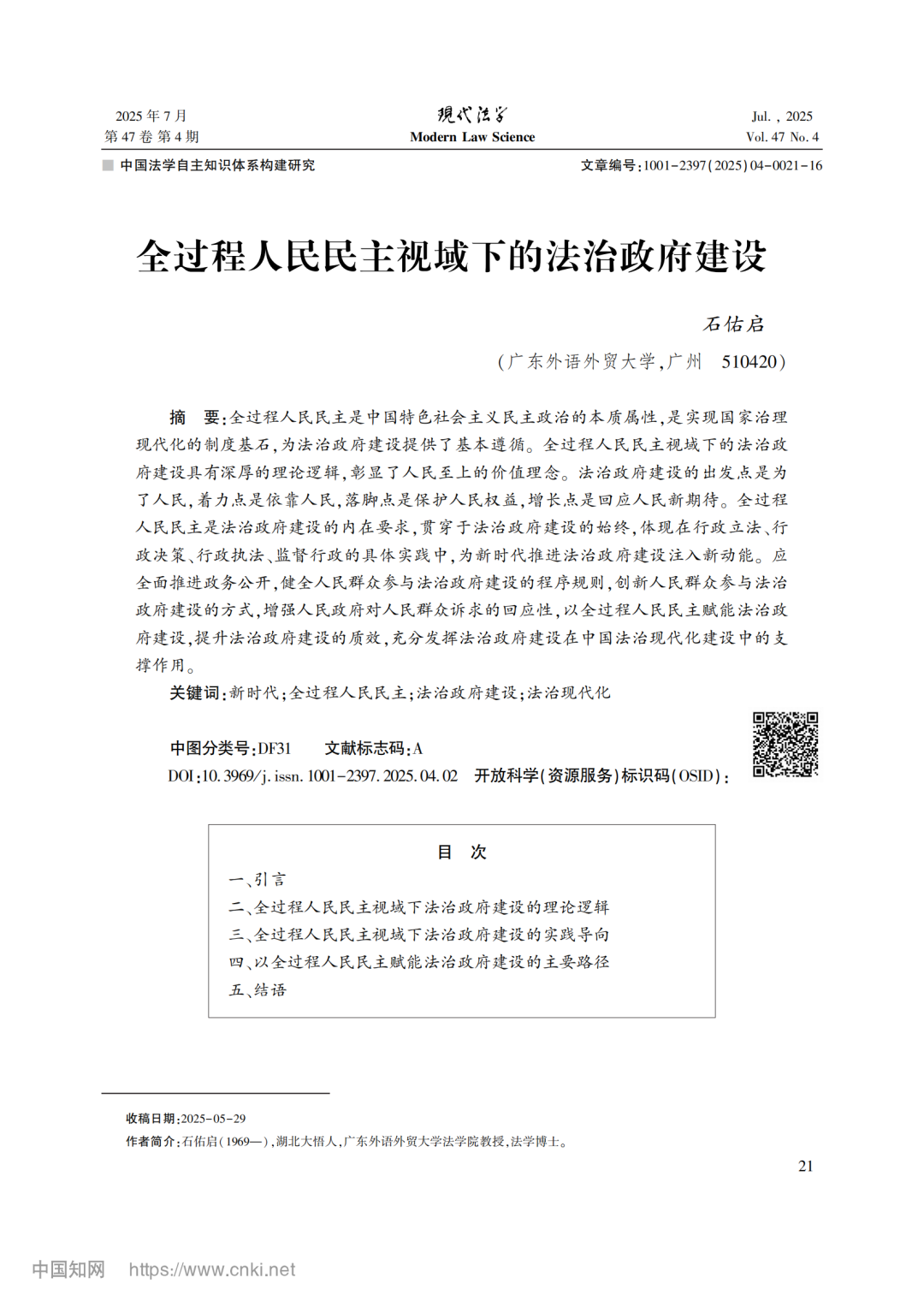 本网讯 近日,《新华文摘》2025年第23期全文转载校党委书记石佑启教授《全过程人民民主视域下的法治政府建设》一文。该文原载于《现代法学》2025年第4期。
