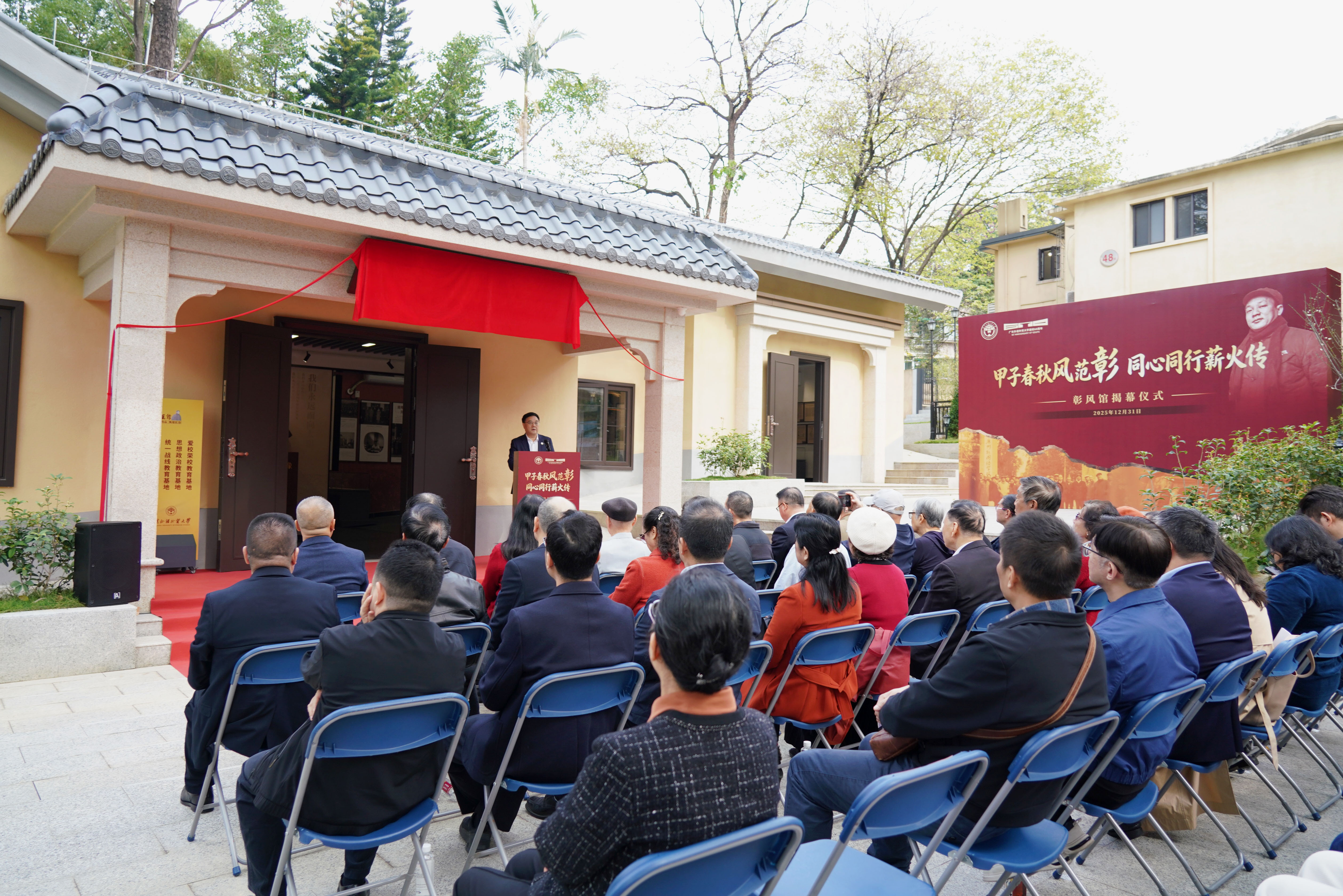 本网讯 12月31日上午,我校师生期待已久的校园文化新地标“彰风馆”在白云山校区隆重揭幕。校党委书记石佑启,党委副书记葛小月,校党委常委、副校长、统战部长谢伟光,校党委常委、副校长杨励以及饶彰风同志革命挚友的后代、饶彰风同志亲友代表、饶彰风同志的老同事代表、校董代表、校友代表、学校相关职能部门代表、校各民主党派和统战团体负责人、师生代表共同出席仪式,仪式由谢伟光主持。