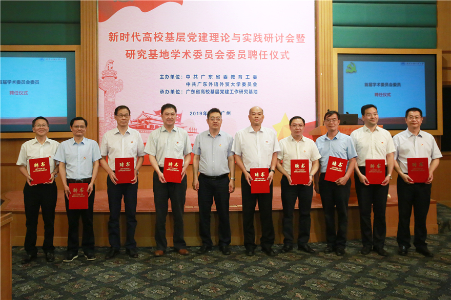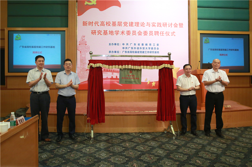 本网讯 6月19日,广东省高校基层党建工作研究基地在我校召开“新时代高校基层党建理论与实践”专题研讨会,并举行研究基地揭牌仪式及学术委员会委员聘任仪式。广东省委教育工委组织处处长廖荣辉,华南师范大学特聘教授、“万人计划”专家、原中共中央党史研究室第一研究部主任、研究员蒋建农,广东医科大学党委书记、校长、广东省高校基层党建工作研究基地学术委员会委员卢景辉,我校党委书记、广东省高校基层党建工作研究基地主任隋广军,我校党委常委、副校长、广东省高校基层党建工作研究基地学术委员会委员刘海春等出席揭牌仪式。