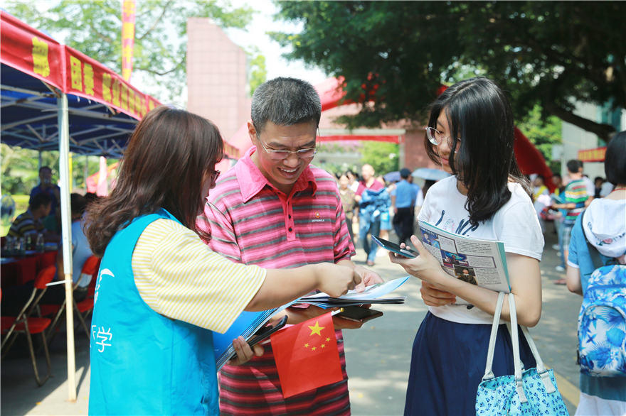 很多考生和家长早早来到了开放日现场。一名家长表示,他们很关注今年新开设的国际组织人才创新班。该班采取“3+1+1”双学位模式,是为了培养高端财经人才而开设,学生毕业时能取得我校学士学位和加州大学硕士学位。他认为这很有吸引力,将大力支持孩子报考此创新班。各学院的摊位前聚集了大批前来咨询的家长。语言类专业依然备受考生和家长们的欢迎。一名考生兴高采烈地谈对我校的第一印象:“小语种专业特色明显,外国文化氛围浓厚”,并表示开放日活动对志愿报考有很大的帮助。一名从去年就开始关注我校的家长谈到,今天来到开放日现场,通过老师们的详尽解答,她对高级翻译专业有更清晰的了解。学者专家们的热情介绍和志愿者的耐心周到也给她留下了深刻的印象。