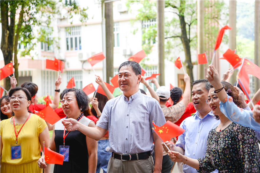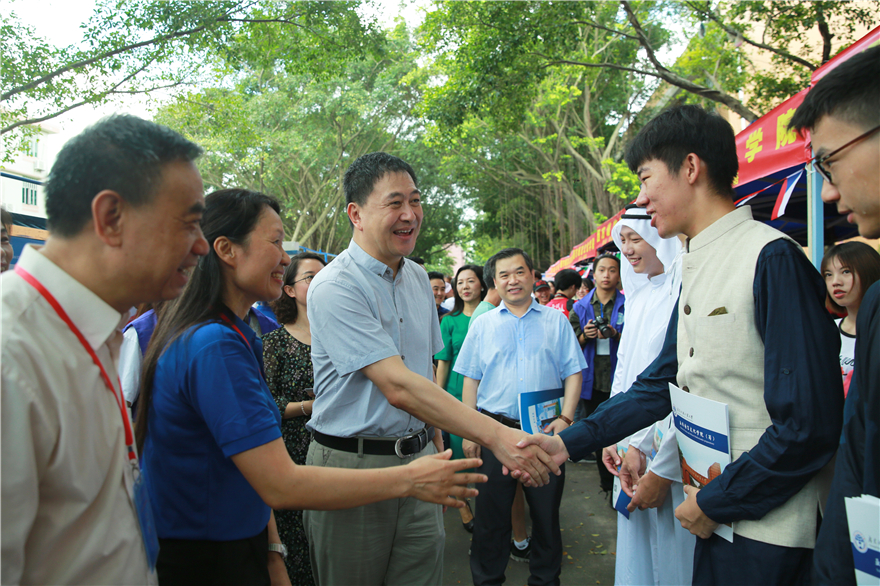 我校党委书记隋广军,副校长刘海春、焦方太以及相关单位主要负责人等到摊位前慰问工作人员。隋广军等逐个摊位走访问候,与负责咨询工作的老师、同学握手并合影留念。隋广军肯定了开放日现场的组织工作,他表示,相关部门安排到位,老师们全情投入,十分感动,“天气很热,但大家仍积极参与,体现出对学校的关爱,对新同学的热情以及对学校未来的信心。特别是快闪活动独具匠心,将开放日和对祖国的歌颂相结合,呈现了一场爱国爱校的教育”。