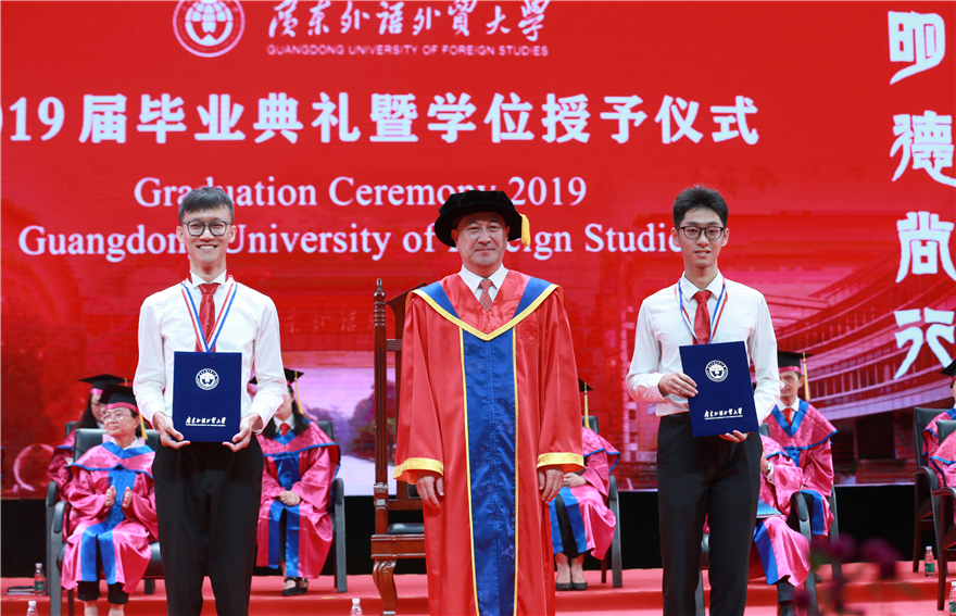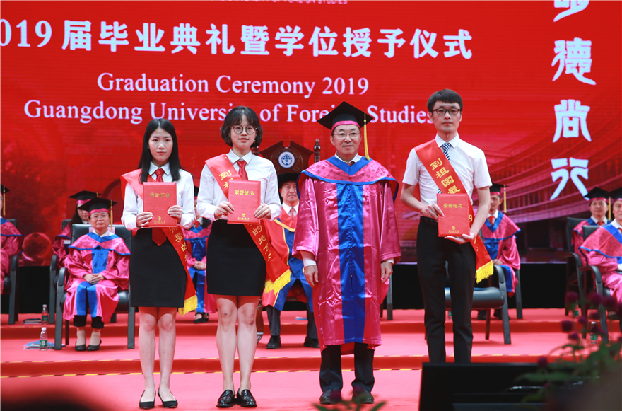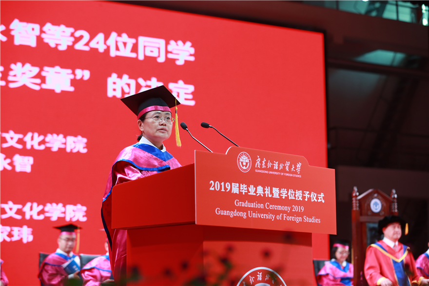 典礼上,我校副校长王廷惠宣读《关于授予缪永智等21名同学2019年“广东外语外贸大学优秀大学生奖章”的决定》《关于表彰2018-2019学年度广东省优秀学生(研究生阶段)的决定》《关于表彰三支一扶及西部(山区)计划、研究生支教团志愿者的决定》《授予2019届毕业生学位的决定》,隋广军为优秀大学生奖章获得者颁奖,校党委副书记李云明为“三支一扶”及西部(山区)计划、研究生支教团志愿者颁奖。首场毕业典礼由副校长焦方太主持。