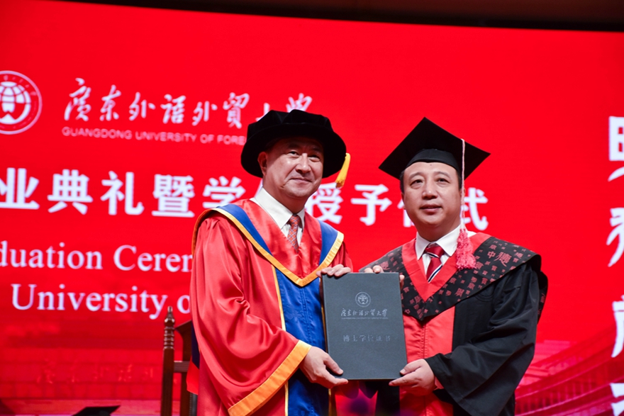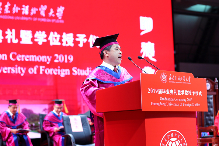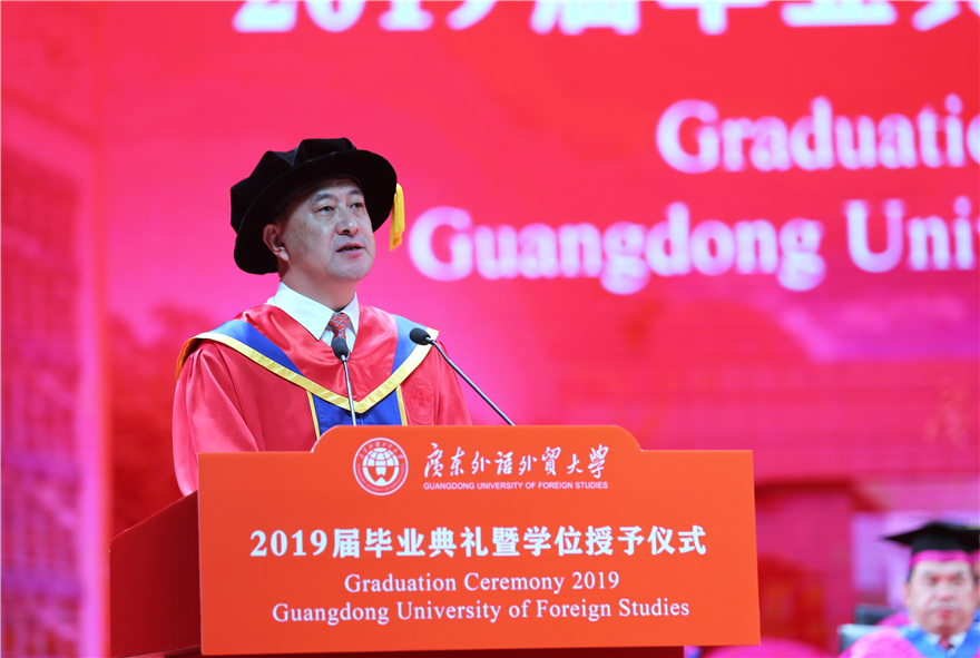 本网讯 6月25日清晨,久违的阳光洒满校园,空气中散发着花草的芬芳,2019届广外毕业生迎来了属于他们的荣耀时刻,也是他们大学的最后一课。喜悦与收获、离别与憧憬在云山会堂里汇聚。校党委书记隋广军在致辞中与毕业生分享了三个故事,寄语毕业生“跑出美好的人生路,跑好民族复兴的接力赛”。