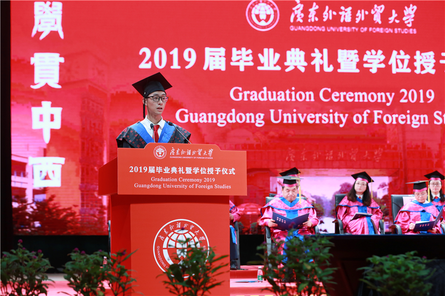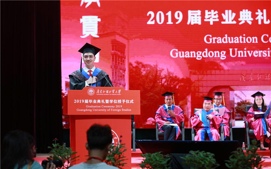 毕业生代表、西语学院杨家玮在发言中回顾了自己大学四年所获得的锻炼和成长。他表示,广外提升了他的语言能力,开拓了他的国际视野,也给予了他追逐梦想和提高自我的机会。所有的成长都离不开母校所提供的资源和平台,未来,他将心怀对母校的感恩,勇敢地迎接未知和挑战,追逐自己想要的人生。