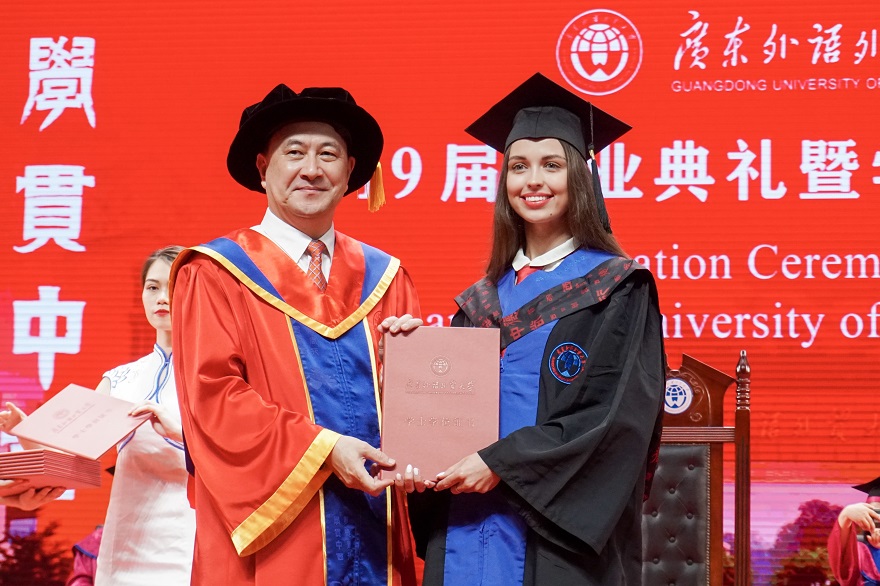 毕业生代表、留学生教育学院巴兹克表示,高度国际化的校园文化孕育出“明德尚行,学贯中西”的广外人。课堂上,老师的谆谆教诲让他们学到了知识和中国文化中最深刻的做人道理;课堂外,丰富多彩的活动更是让他们大开眼界。他祝愿大家,怀着对这个世界最大的善意继续前行,虽前路荆棘,但不忘初心,方得始终。