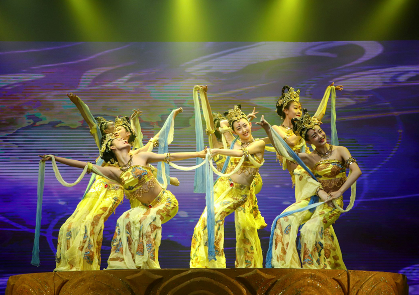 我校艺术学院舞蹈专业的6位同学为大家带来的歌曲表演《从现在开始》,歌声婉转动人,优美的旋律在光影间闪烁流动;星海音乐学院带来的女子群舞《飞天》惊艳众人,那衣带的翻转、空中的轻灵,让观众仿佛置身于人间仙境,美不胜收。