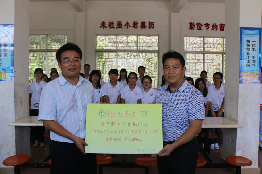 最后,扶贫队伍来到黄坌老区学校,看望我校自强社“自强之心”三下乡服务队。谢应东在讲话中鼓励队员发扬革命老区精神,艰苦奋斗,尽快适应当地生活;表扬三下乡队员“左手济困,右手公益”的理念,积极为黄坌老区学校的儿童教育事业做出贡献。此外,谢应东代表自强社向黄坌老区学校捐赠了图书,希望自强社成员用自己的身体力行激发当地小学生树立“知识改变命运”的意识,为黄坌的教育脱贫传播火种。