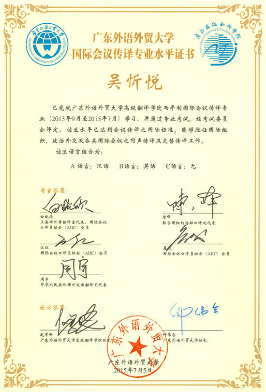 按照国际职业化会议口译人才培养的通行做法,广外国际会议传译证书班在完成首批学员的两年课程后,举行了严格的专业水平考试。考试分为交传英译中、交传中译英、带稿同传英译中、带稿同传中译英、无稿同传英译中、无稿同传中译英六科。六科全部通过的学员,才能获得广外国际会议传译专业水平证书。