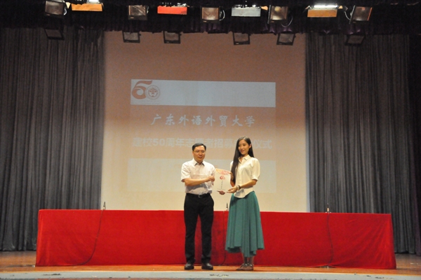 刘海春为我校政治与公共管理学院研究生、省学联执行主席、校团委书记助理吴怡颁授广东外语外贸到大学建校50周年志愿者“5010001”号证书,标志着校庆志愿者招募工作正式启动。