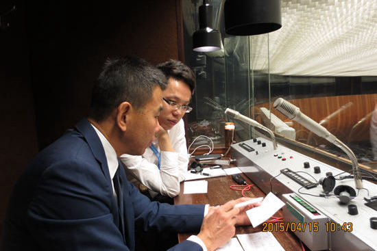 口译处中文科资深译员吴杰在会场同传厢内指导学员