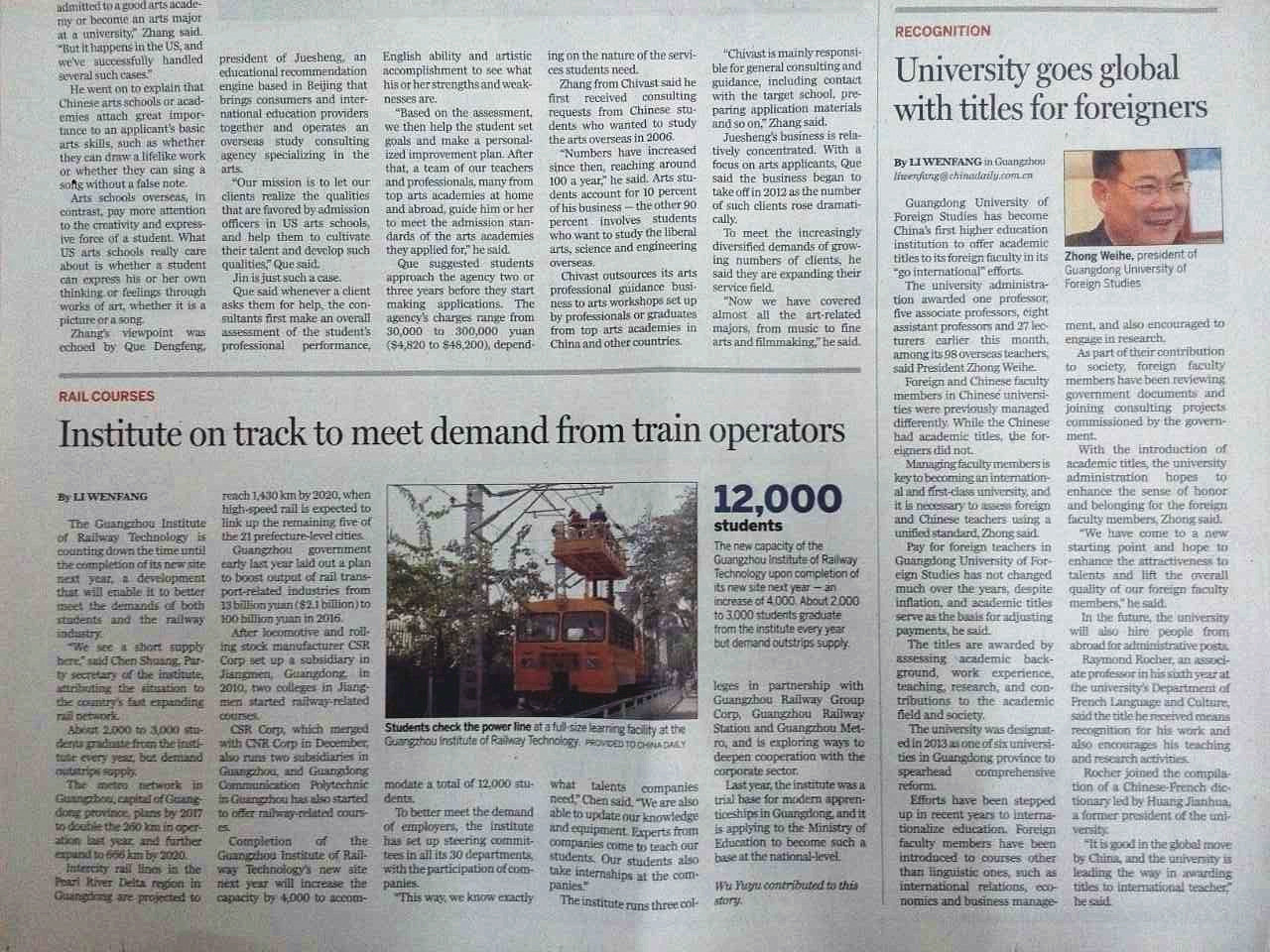 编者按 1月8日,我校举行外教专业技术职务聘书颁发仪式,首批41名外教受聘广外职称,校长仲伟合为受聘外教颁发聘书。作为国内首家评聘外教职称的高等院校,中国日报网、南方日报就我校推出的这一开创性办学举措进行了报道。近日,为更深入了解我校评聘外教职称的相关背景、评聘标准以及评聘外教职称对我校推进国际化进程、激发外教教学科研动力等方面的作用,中国日报广东记者站副站长李文芳专门来访我校,就相关问题专访我校校长仲伟合,并与受聘外教代表深入交谈,了解他们受聘后的感想感受。1月26日,CHINADAILY教育版刊发了英文报道文章《University goes global with titles for foreigners》,学校新闻网特将该报道进行全文转载,以飨读者。