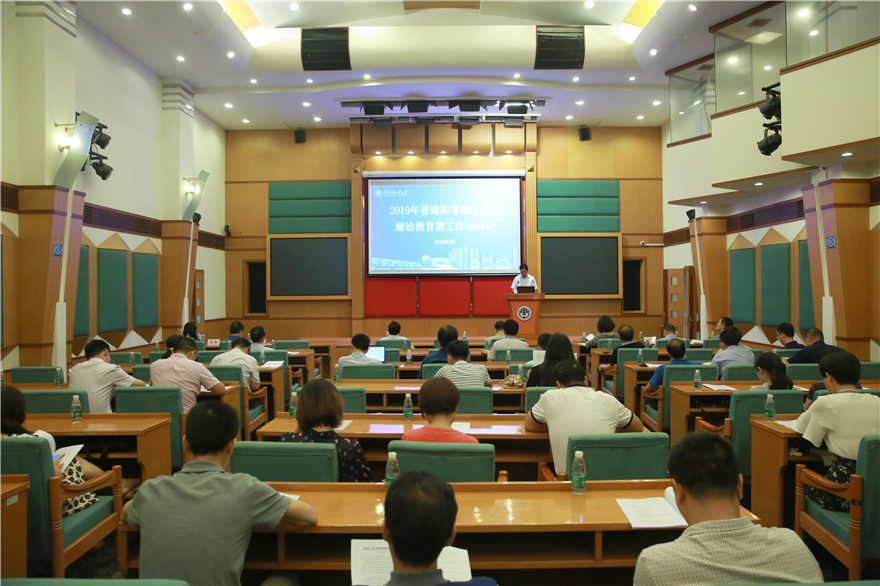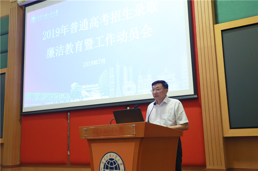 本网讯 2019年普通高考招生录取在即,为确保招生录取工作顺利进行,7月11日下午,我校于国际会议厅召开2019年普通高考招生录取廉洁教育暨工作动员会。校党委书记隋广军、招生委员会成员、纪委办(监察处)、教务处、保卫处、后勤处、网络中心、校门诊部及各学院(部门)参加录取的工作人员出席了会议。