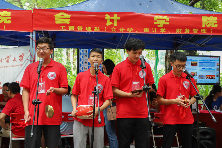 会计学院的摊位前摆放着一排麦克风,穿着整齐红色院服的学生们在轻唱着熟悉的旋律,仔细听,才发现他们改编了歌词,歌词中融入了会计知识与日常学习的内容“坐在你旁边的座位看中财,图书馆的灯还亮着你没走。”,“微观经济财务管理EAP,再也没有人每天监督你学习”,他们或相视而笑,或专注深情,表演凸显出课程内容的特色与大学生活的蓬勃朝气。新闻传播学院在二教中庭设置了科技感极强的 虚拟现实设备(VR)体验区,跟紧了新媒体时代前沿的步伐。负责布展的老师表示:“VR在新闻领域的应用越来越广泛了,在新传学院课程的开设上也有应用到VR技术的工作坊。”艺术学院以一支新疆舞表演吸引了学生与家长的目光。少女们婀娜妙曼的身姿伴随着身边搭档充满力量感的回应,不仅活跃了全场的气氛,也表现出广外学生对来宾的热情。