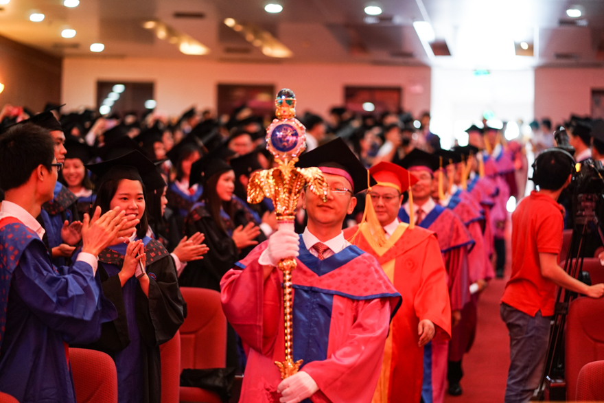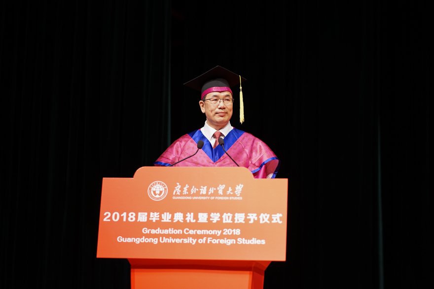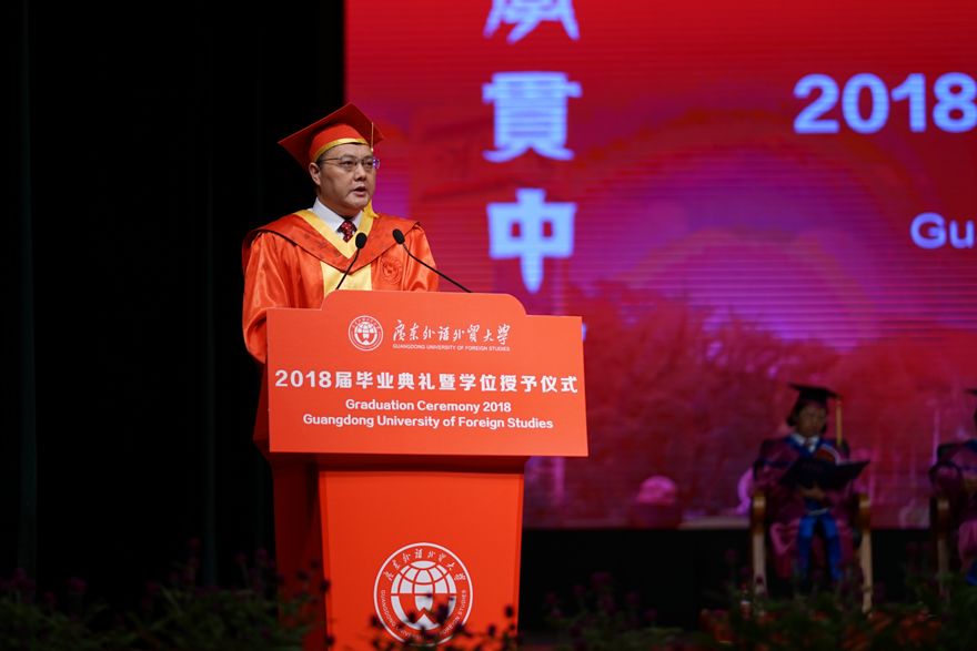 本网讯 恰逢青葱岁月诗意年华,2018届毕业生们即将踏上人生新征程。6月28日上午,南校区首场2018届毕业典礼暨学位授予仪式在大会堂举行。在广外的最后一课,校长石佑启勉励毕业生们要“秉承‘卓越、诚信、包容、自信’的广外价值观,深怀一颗爱国心、敬畏心、平常心、进取心,做新时代有为青年。南校首场毕业典礼是马克思主义学院、经贸学院和新闻学院专场,由副校长何传添主持,副校长陈林汉和阳爱民、导师代表、校董代表、校友代表、家长代表出席。