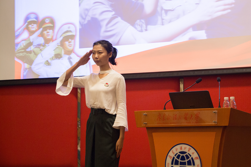 退伍学生代表、艺术学院的罗慧为同学们做了征兵动员,汇报了她这两年的军旅生涯。她提到作为一名军人时勇敢地挑战自我,承担做得更好更努力的责任;作为战友时在风吹日晒的训练之中收获了一群珍贵的兄弟姐妹。她引用“长风破浪会有时,直挂云帆济沧海”的诗句,鼓励同学们好好把握,学会给生活添彩,创造一段一生中难忘的军旅回忆。