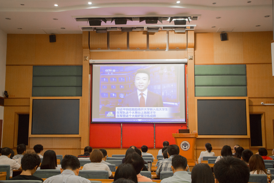 会议上播放了征兵宣传工作视频,影片重温了习近平总书记给南开大学8名新入伍大学生的回信,习近平总书记高度肯定了他们携笔从戎、报效国家的行为,希望他们“在军队这个大舞台上施展才华,在军营里这个大熔炉里淬炼成纲,书写绚烂、无悔的青春篇章”。