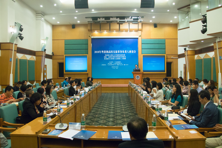 本网讯 6月5日,2018粤港澳高校交流事务负责人座谈会在北校区行政楼国际会议厅举行。来自香港中文大学、澳门大学、中山大学等粤港澳三地47所高校交流事务负责人围绕“粤港澳大湾区大学集群协同发展,国际一流湾区和世界级城市群建设,更加强有力的智力支撑和人才保障”这一主题进行了交流。我校副校长焦方太,广东省教育厅港澳台事务办公室主任李金俊、广东省人民政府港澳事务办公室社会处副处长郑永辉出席座谈会。
