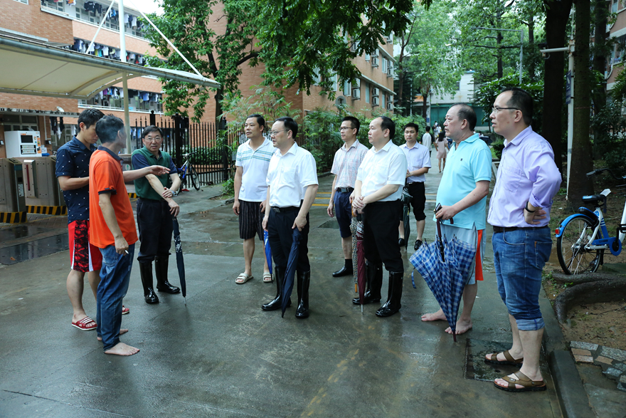 校党委副书记石佑启、李云明,副校长何传添、阳爱民带领党办、校办,保卫处,学生处,后勤处等单位负责人到宿舍看望受灾学生,现场工作指导救灾工作。南校区部分区域遭受浸水,副校长刘海春在现场应急指挥,协调相关部门开展抗洪工作。