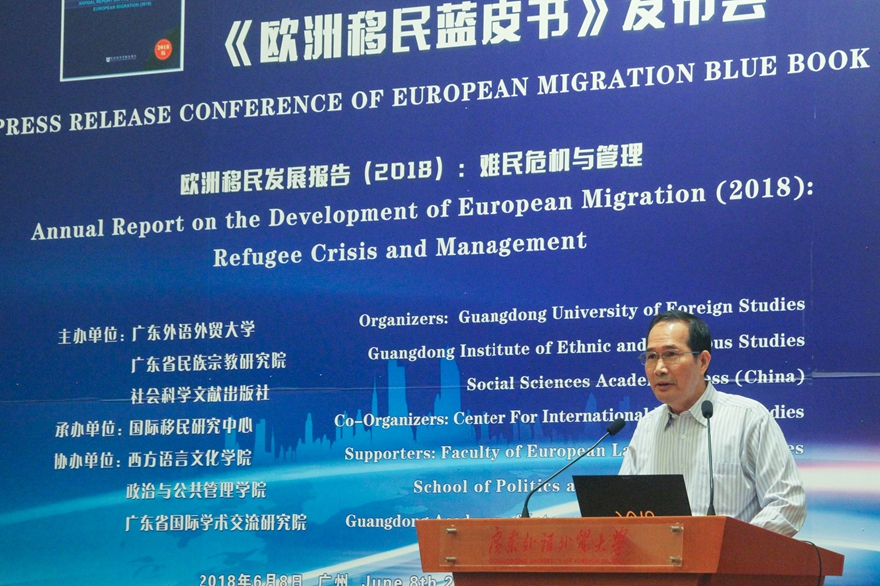 本网讯 由广东外语外贸大学、广东省民族宗教研究院和社科文献出版社主办,国际移民研究中心承办的《欧洲移民蓝皮书》发布会于6月8日在北校区国际会议厅举行。我校副校长阳爱民、广东省民族宗教研究院院长黄心怡、社会科学文献出版社副社长梁艳玲、法国驻广州领事馆高等教育署负责人倪蓝天等嘉宾受邀出席本次发布会并发言致辞。50多位专家和学者参加了发布会。