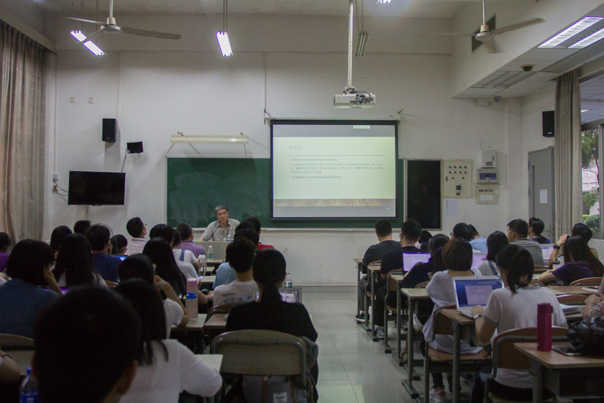 本网讯 5月15日,今年我校首场人文大讲坛在南校区F座教学楼103举行,美国路易维尔大学政治学终身教授、亚洲研究杰出讲席教授、亚洲研究部主任华世平担任主讲嘉宾,为法学院师生带来了一场主题为“中美政治文化比较:从托克维尔和韦伯谈起”的精彩讲座。华世平从托克维尔的著作《论美国的民主》和《马克斯·韦伯的中国的宗教:儒教与道教》出发,结合自己的经历,阐释了中美政治文化中的异同。我校党委宣传部、教师工作部部长胡文涛出席讲座,讲座由法学院副院长王树春主持。