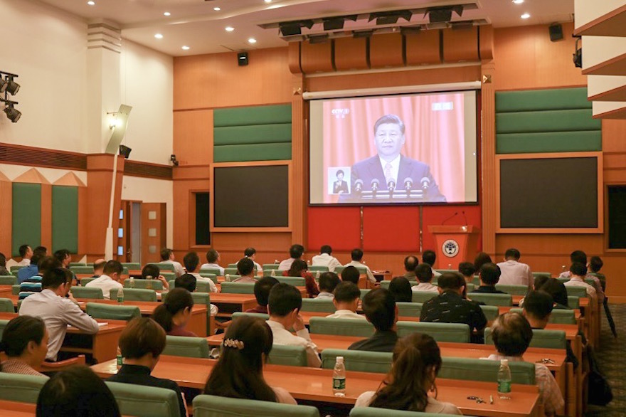 本网讯 5月4日上午10时,纪念马克思诞辰200周年大会在人民大会堂举行,中共中央总书记、国家主席、中央军委主席习近平发表重要讲话。我校在北校区国际会议厅开设大会电视直播会场,组织校领导、校部机关副科以上干部集中收看。