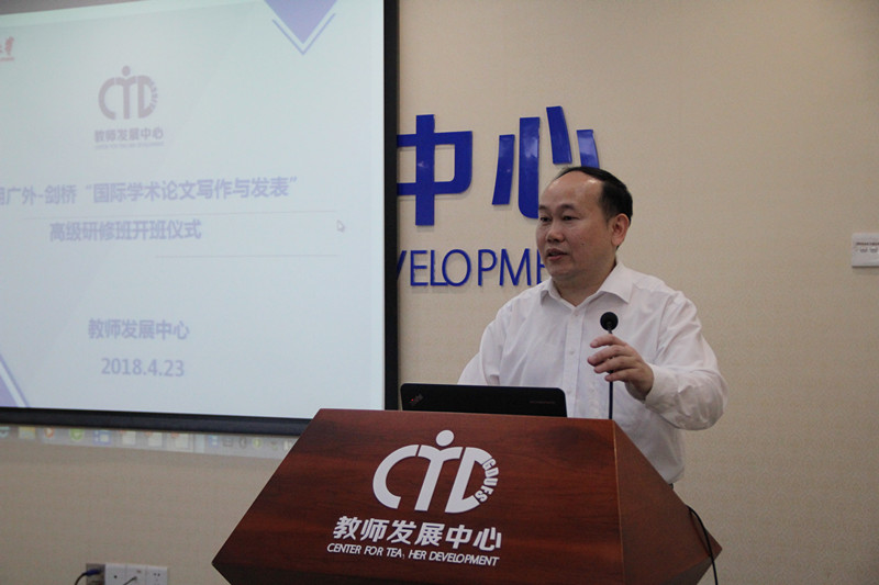 阳爱民在致辞中表示,作为一所国际化特色鲜明的大学,教师国际化、科研国际化是我校教育国际化的重要内容。近年来,学校不断加强国际化教师队伍建设,教师发展中心开发一系列旨在促进教师专业化成长的研修项目,走在广东省属高校的前列。在促进科研国际化方面,我校注重谋划,以国家重大需求为导向,聚焦重大现实问题,有重点地培养培育科研项目,取得较为显著的效果。同时,他指出2017年我校教师共发表1700多篇学术论文,但只有100多篇国际学术论文,占总论文发表数不到十分之一,意味着我校400多名外语教师的外语优势尚未尽显,在学校“冲一流、强特色、补短板”的战略发展阶段,学校要进一步提升教师的国际化水平。在此背景下,教师发展中心继续开展“国际学术论文写作与发表”研修班,有利于推动教师提高科研国际化能力。