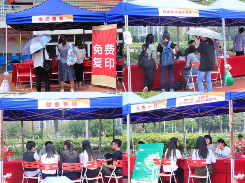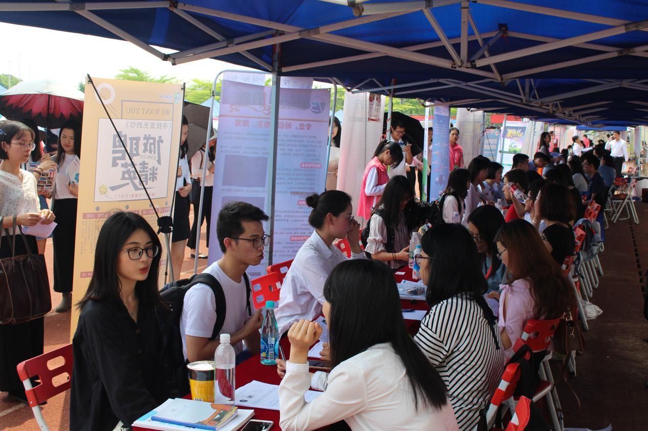 本次招聘会由广州市人力资源和社会保障局主办,中国南方人才市场(广州市高校毕业生就业创业指导中心)、广东外语外贸大学承办,广州南方人才大学生就业市场有限公司、广州市青年就业创业协会、南方人才网协办。本场招聘会有4个突出特点。一是通过“互联网+”模式进一步提升了工作效率。学校与广州市高校毕业生就业创业指导中心合作,使用智能就业平台系统,用人单位从报名、资料提交、审核确认到参会通知,均通过网络完成,在便利用人单位的同时,提高了招聘会的筹备工作效率。二是为用人单位提供全程免费贴心服务进一步提升服务水平。本场招聘会不收取参会单位任何费用,为每家参会用人单位提供一个标准招聘摊位(包括帐篷、宣传横眉、桌椅以及饮用水等服务),每两个摊位配备专职志愿者一名,学校也从会前的参会指引,到会场招聘和会后面试提供了一系列贴心的服务。三是设置功能齐全的服务区进一步提升服务效能。现场设置两块功能齐全、各有侧重的服务区,现场指挥部旁设置求职咨询、简历修改指导、创业咨询、三支一扶政策咨询、医疗服务、安保服务、综合服务等功能区;面试区旁则设置求职学生休息区、复印点、餐饮服务区等功能区。四是强化各方安保投入进一步提升安全保障。在番禺区公安局、小谷围派出所的直接参与和指导下,学校在活动现场及周边布置了充足的安保力量,确保招聘会安全有序的进行。